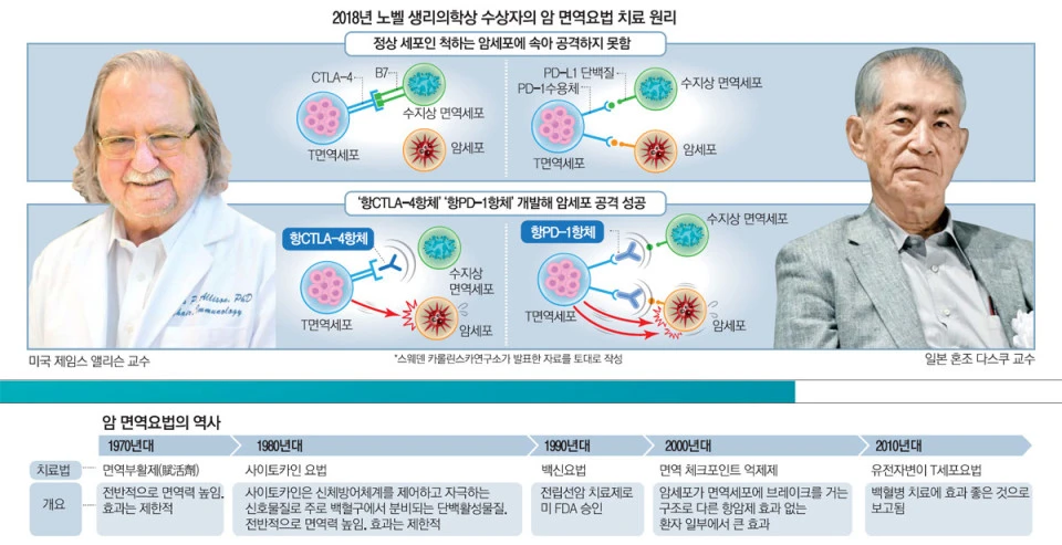 (1) 6조 엔(60조 원) 시장으로 커진 항 PD-1 항체. PD-1은 활성화된 T세포(면역세포)의 표면에 있는 단백질이다. CD279, Programmed cell death protein 1 이라고도 한다. 암세포의 표면에 있는 단백질인 PD-L1, PD-L2가 T세포의 표면에 있는 단백질인 PD-1과 결합하면, T세포는 암세포를 공격하지 못한다. 면역 항암제는 T세포의 PD-1 수용체에 달라붙어 암세포의 회피 기능을 억제한다.