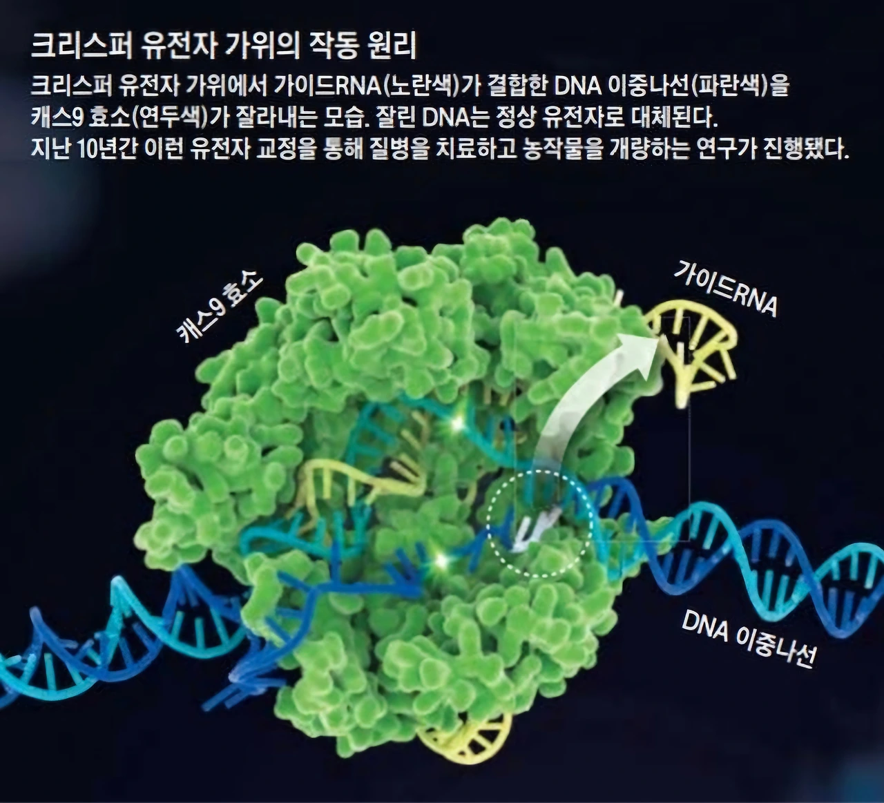 유전자 가위 기술을 가상으로 구현한 그림. 이 그림처럼 가위를 이용하는 것은 아니지만 효소를 이용해 특정 유전자 부위를 잘라내는 기술을 유전자 가위라고 부른다.
