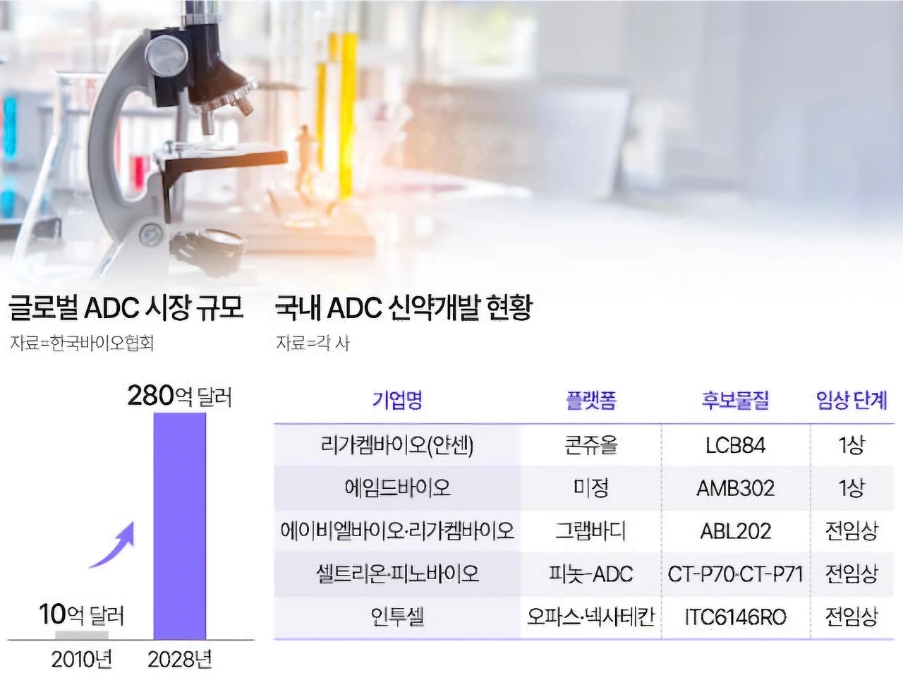 국내 기업인 '리가켐바이오', '에이비엘바이오' 등도 세계 시장에서 ADC 기술력을 인정받고 있다. 리가켐바이오의 ADC 후보물질 LCB84는 현재 임상 1상을 진행 중이며, 2025년에 임상 2상에 진입할 전망이다. 지난해 말 리가켐바이오는 미국 존슨앤존슨(J&J) 자회사인 얀센 바이오텍과 LCB84의 개발과 상용화에 대한 기술이전 계약을 체결했다. 동아에스티도 지난해 ADC 전문 업체 앱티스를 인수하며 ADC 후보물질뿐 아니라 항체에 원하는 양의 약물을 결합시키는 링커(연결부)까지 확보했다.