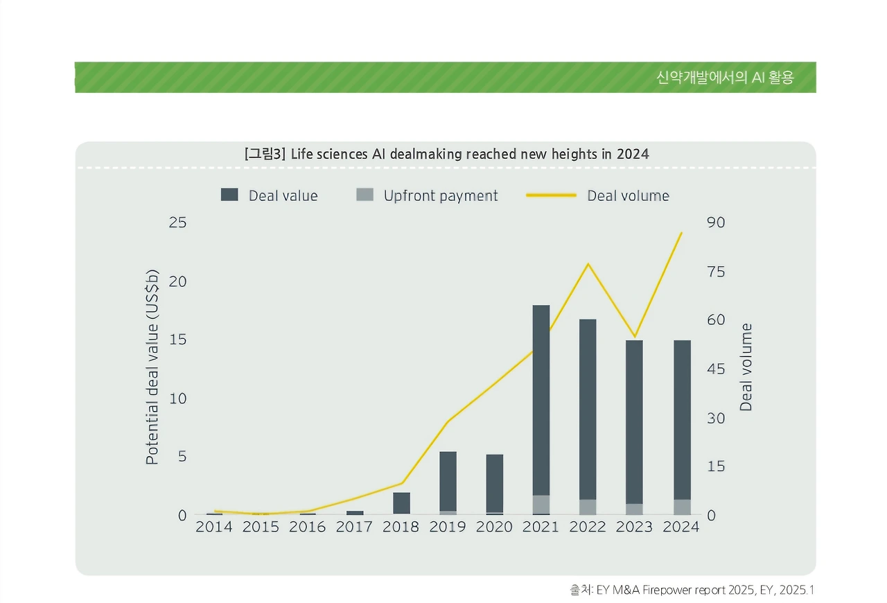 글로벌 회계 컨설팅 기업 언스트영(EY)에 따르면, 글로벌 생명과학기업들은 최근 5년간(2020~2024) AI 관련 파트너십과 인수합병이 급증하였으며, 이는 기업들이 성장 기회라고 인식하고 있음을 보여준다.