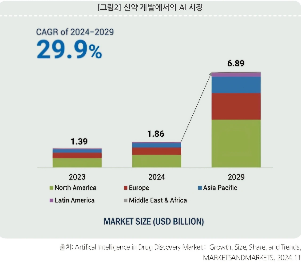 MARKETS AND MARKETS에 따르면, 신약개발에서 AI 활용에 대한 글로벌 시장은 2024년 18억 6,000만 달러에서 연평균 29.9% 성장률로 2029년 68억 9,000만 달러에 이를 것으로 예상하고 있다.