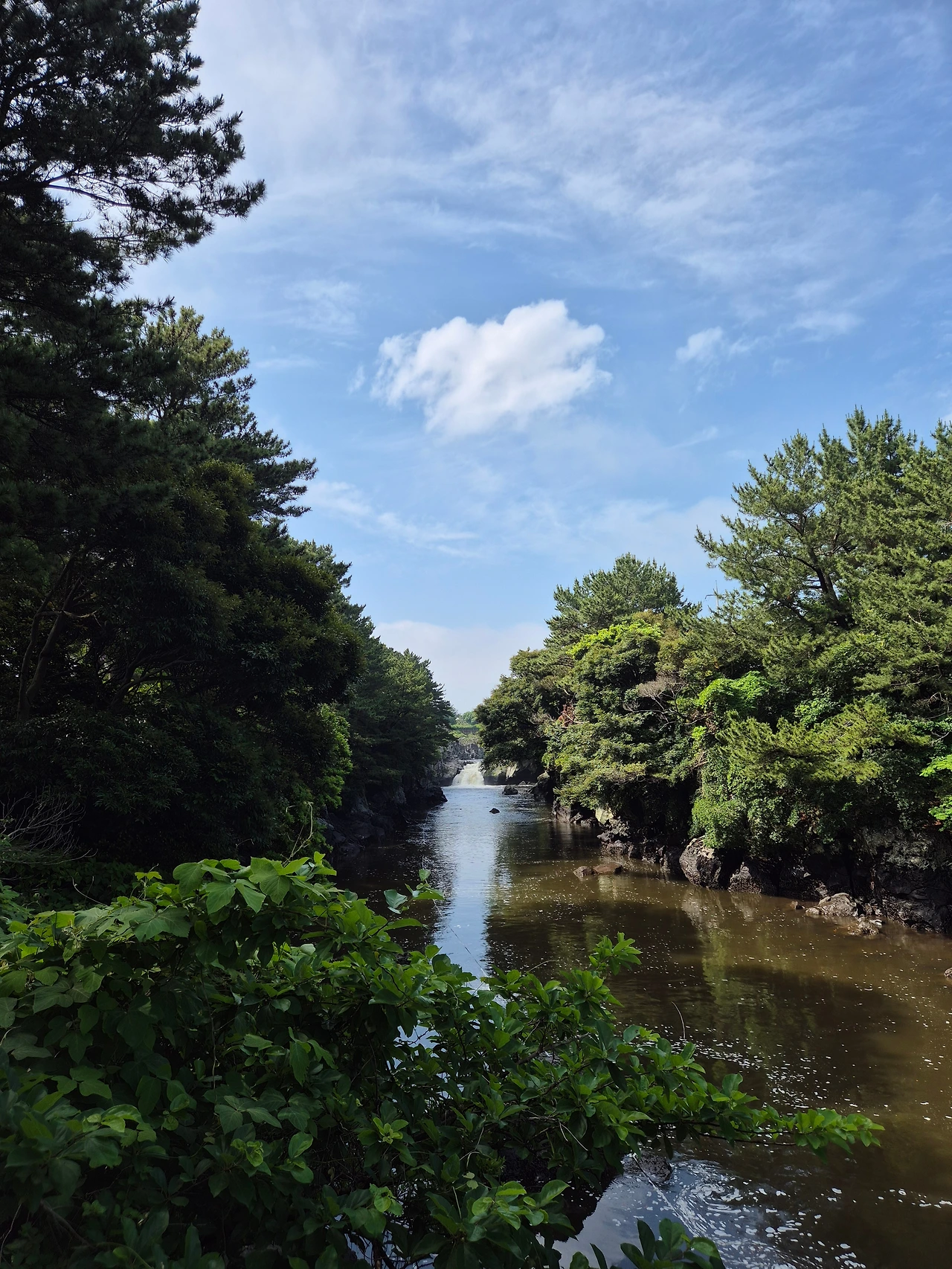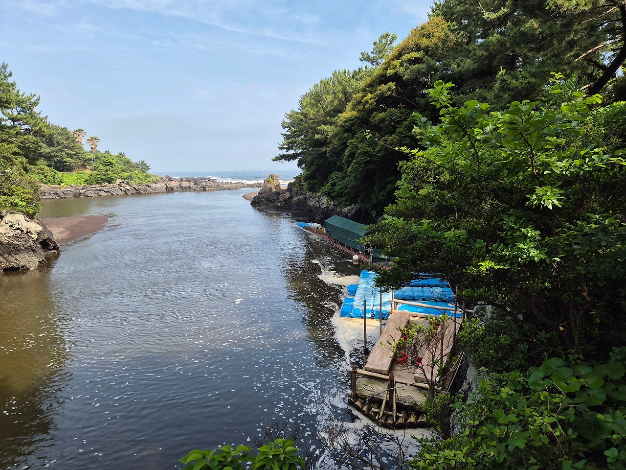 폭포수가 강줄기를 이루고 너른 제주 바다로 흘러나갔다