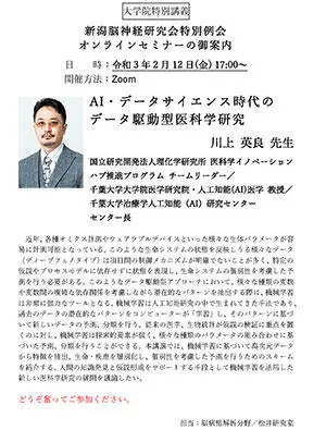 제4회인 이번 회는 이화학연구소 IMS 생명 의과학연구센터 예측 의학 특별프로젝트 의료 데이터 수리 추론특별팀 팀 대표이자, 치바대학교 대학원 의학연구원 AI 의학 교수, 치료학 AI 연구센터의 센터장인 가와카미 교수에게 강연을 듣는다.