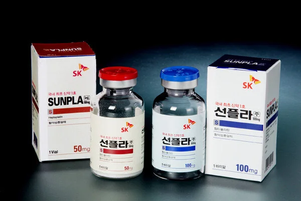 식품의약품안전청은 13일 SK케미칼과 SK제약이 개발한 항암제 `선플라주(注)'에 대한 시판허가를 최종 결정, 제약산업사 100년 만에 처음으로 신약을 개발하는 데 성공했다고 밝혔다. (중략) SK제약은 지난 90년부터 선플라주의 개발을 시작, 10년간 모두 81억 원에 달하는 연구개발비를 투입한 끝에 시판 허가를 받았으며 오는 9월부터 시중에 공급할 예정이다.