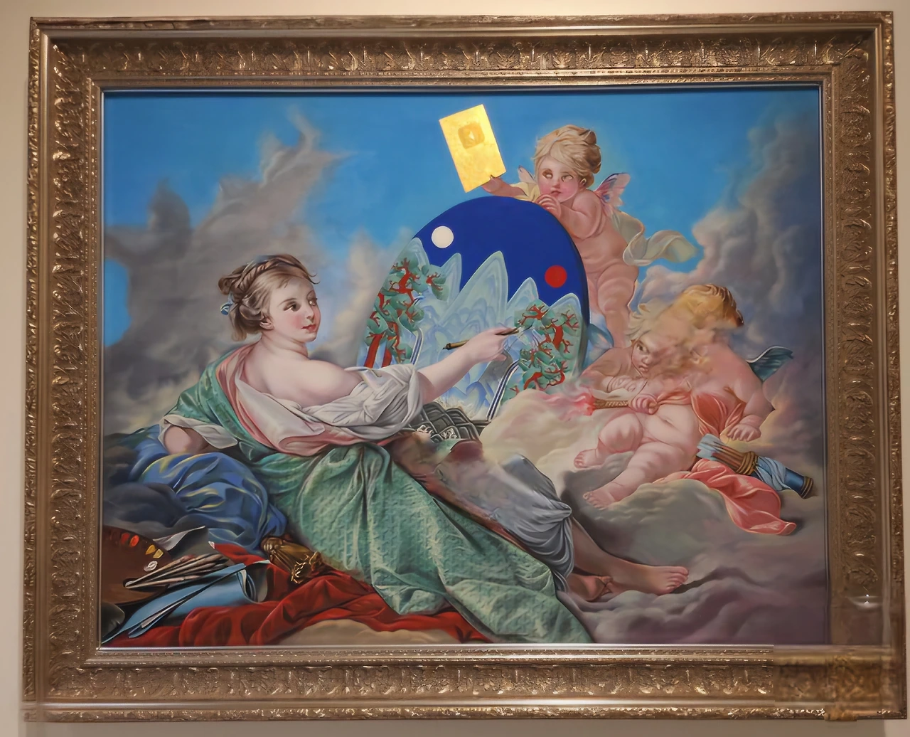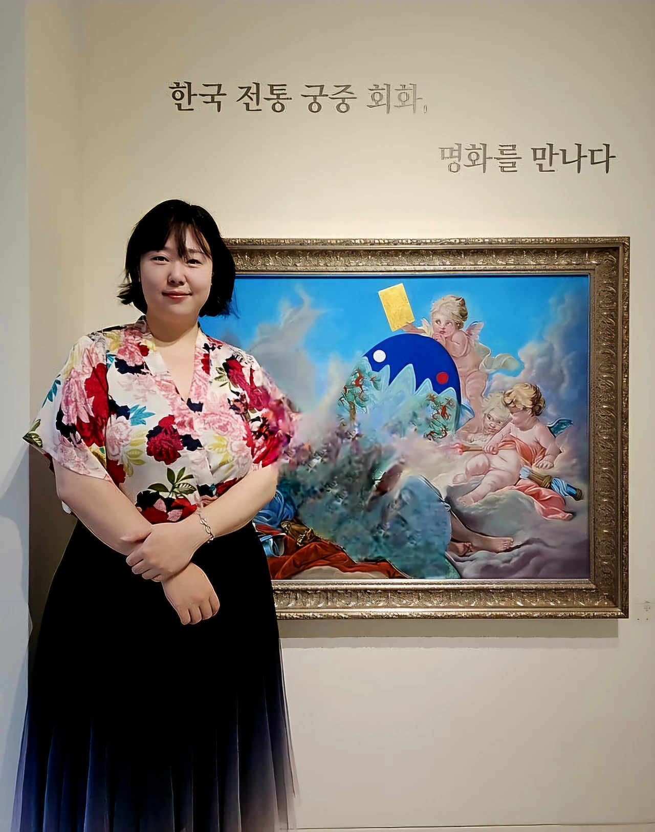 가장 오래 시선을 붙든 것은 〈자화상〉이었다. 비단 위, 진채로 그린 여신이 일월오봉도를 그리고 있다. 한복 대신 명품 패턴의 드레스, 옆에서는 천사가 유튜브 골드 버튼을 든다. 욕망과 전통, 장인의 공력과 대중의 플랫폼이 한 화면에서 충돌하지 않고 공존한다. “명화를 보며 배우고, 익숙한 것을 통해 나의 인생을 보여주고 싶었다”는 작가의 말처럼, 그는 오마주를 기술 훈련의 기록이자 자기 서사의 도구로 삼는다.