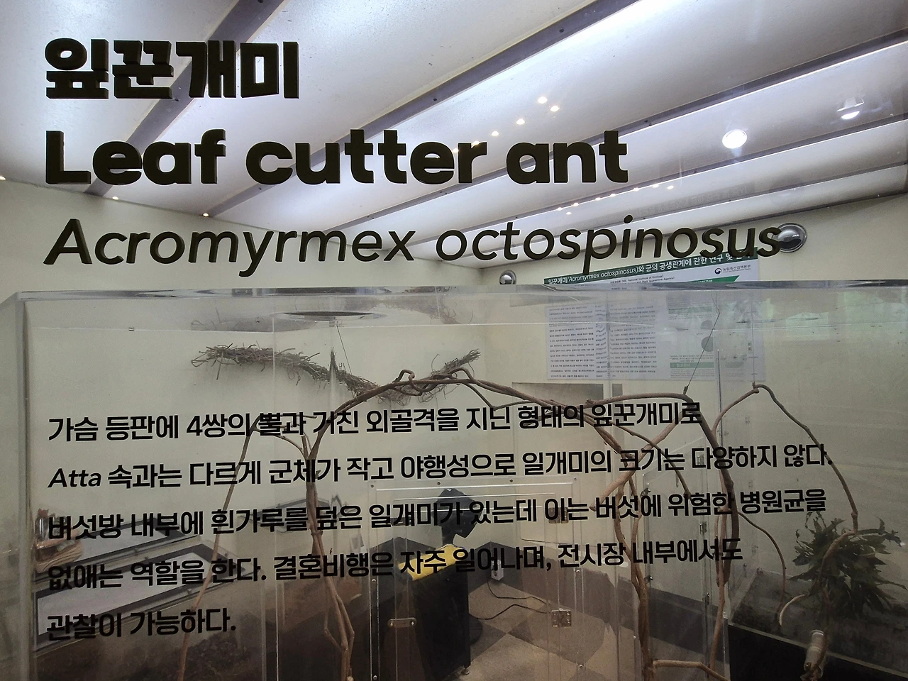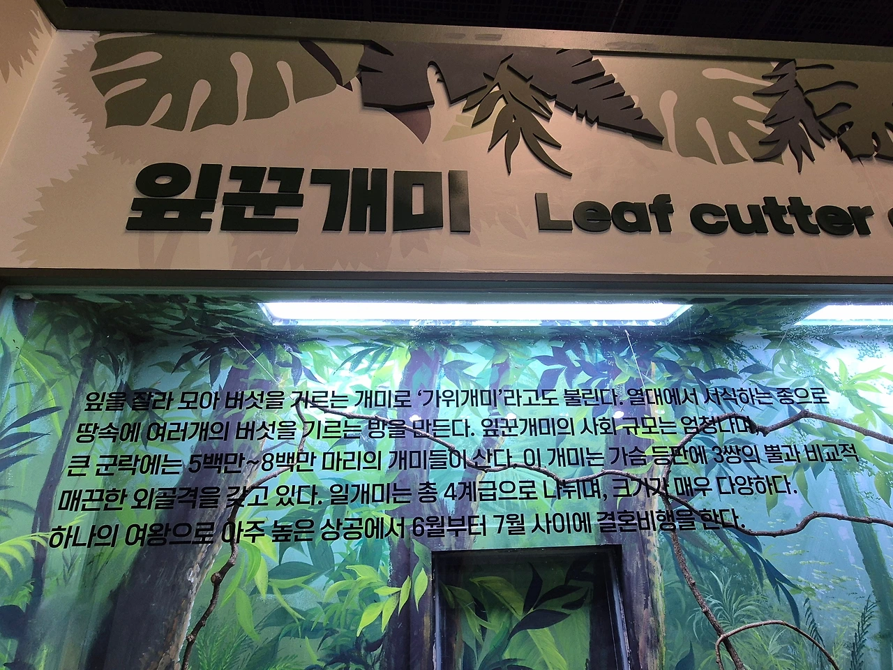 무엇보다 내 시선을 붙잡은 건 기획전시관에서 만난 ‘잎꾼개미’였다. 몸집보다 수십 배 큰 잎을 잘라 모아 줄줄이 운반하며, 땅속에서 버섯을 기르는 부지런한 개미들. “영차, 영차” 소리가 들리는 듯했다. 게으른 베짱이와 대비되는 그들의 부지런함을 카메라에 가득 담았다. 움직이는 장면 하나하나가 오랫동안 마음에 남았다.