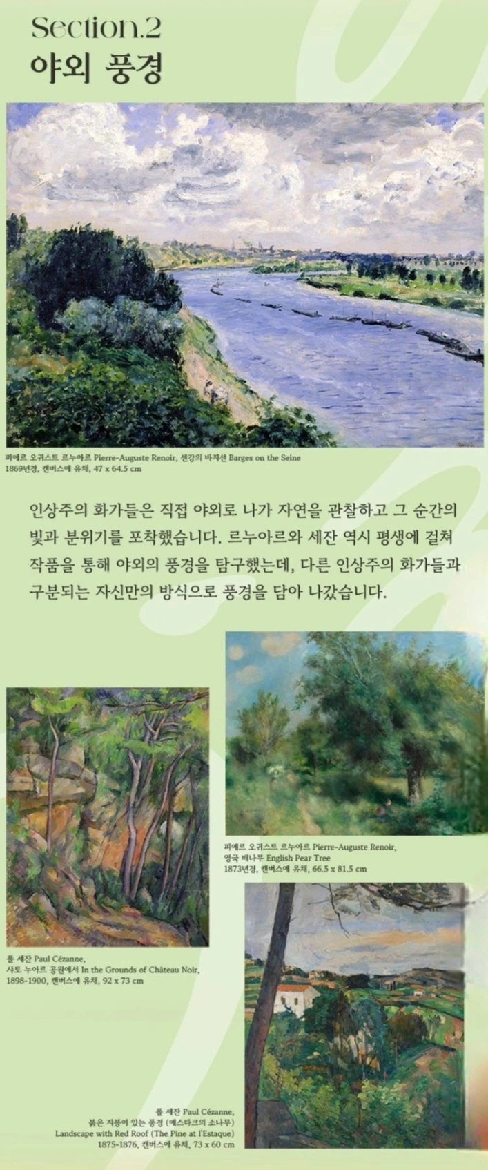 세느 강변 풍경, 숲 속 나무, 언덕 위 마을... 인상주의 화가들이 즐겨 찾았던 ‘야외’의 주제다. 르누아르는 빛과 공기의 흐름을 화면에 담아 순간의 감각을 붙잡았고, 세잔은 풍경을 구조물처럼 단단히 세워 올렸다.