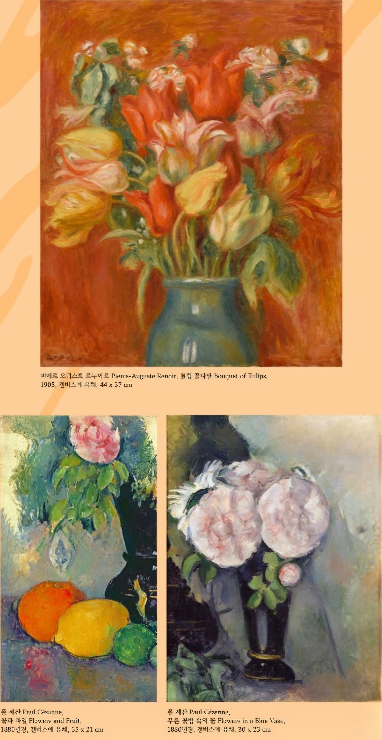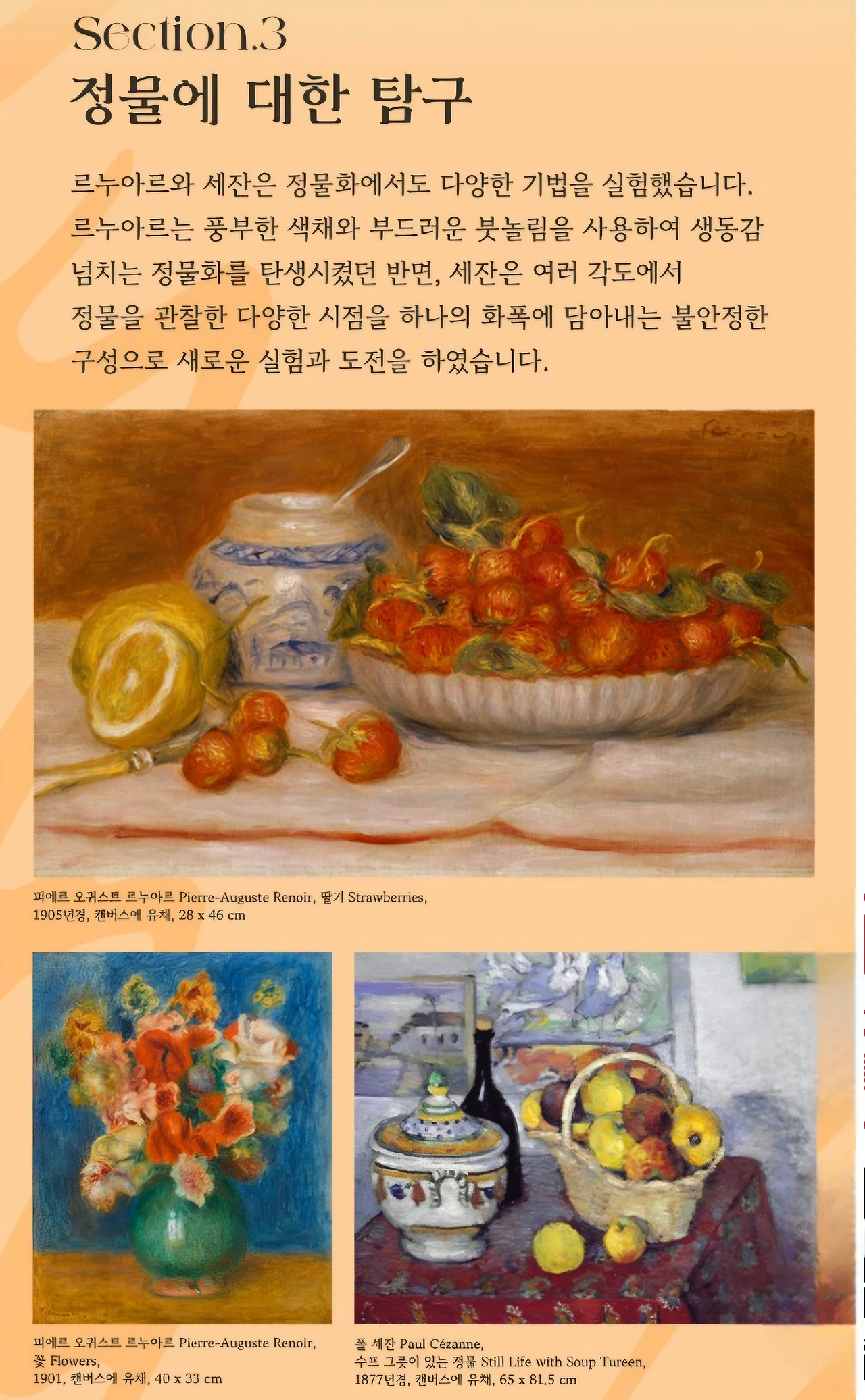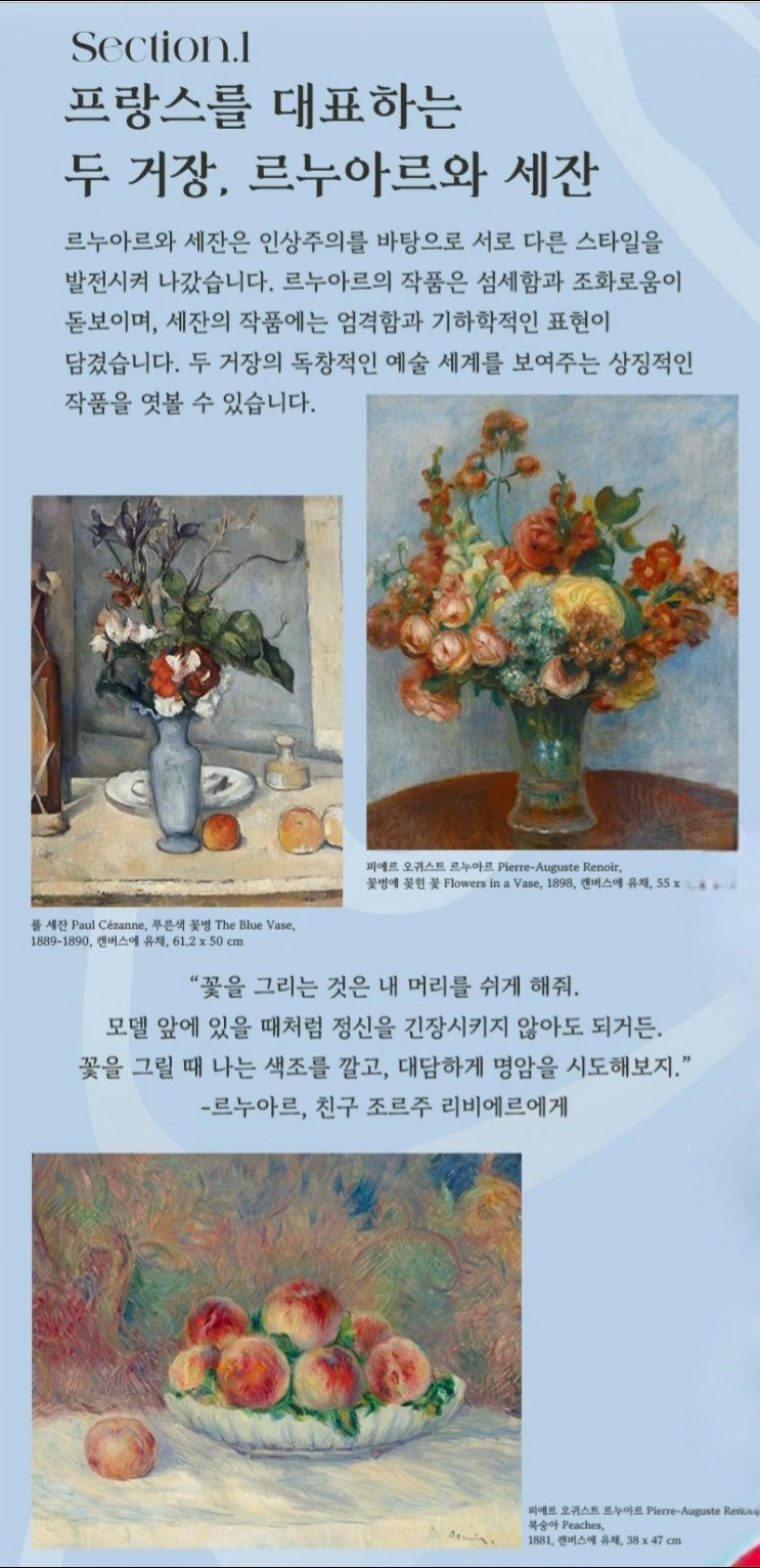 전시의 서두는 두 화가의 대표작으로 시작된다. 르누아르는 꽃과 과일을 화사한 색채로 그려 일상의 따뜻함을 담았고, 세잔은 정물과 기물을 기하학적으로 배열해 구조와 긴장을 강조했다.