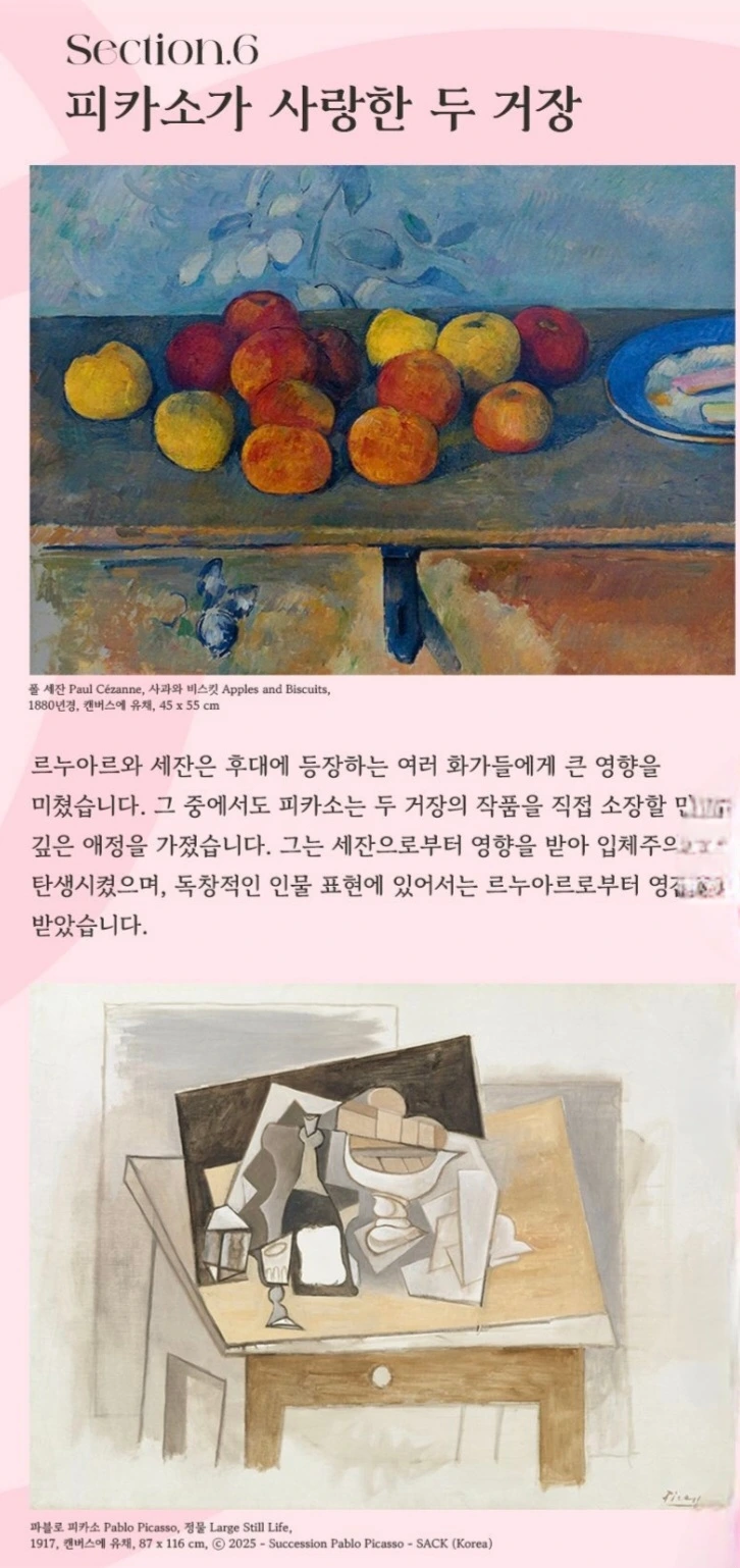 마지막 섹션은 피카소의 작품으로 이어진다. 그는 세잔에게서 구조적 힘을, 르누아르에게서 인간적 온기를 받아들여 자신의 회화 세계를 열었다. 두 거장의 영향은 피카소라는 또 다른 거장에게 이어져 20세기 미술을 이끌었다.