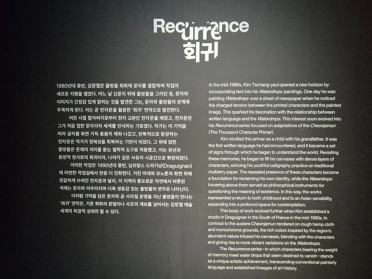특히 1980년대 이후 그는 물방울 위에 한자와 문자를 겹쳐 그리며 ‘회귀(Recurrence)’ 연작을 발표했다. 어린 시절 할아버지와 함께 읽었던 천자문이 물방울과 겹치며, 언어와 이미지가 공존하는 또 다른 사유의 장을 열었다. 그것은 단순히 개인의 기억을 넘어, 한국적 정체성과 동양적 사유를 세계 미술 속에 각인시키는 실험이었다. 물방울 속에 글자가 스며든 순간, 나는 그것이 단순한 회화가 아니라 “생각하는 그림”이라는 것을 깨달았다.
