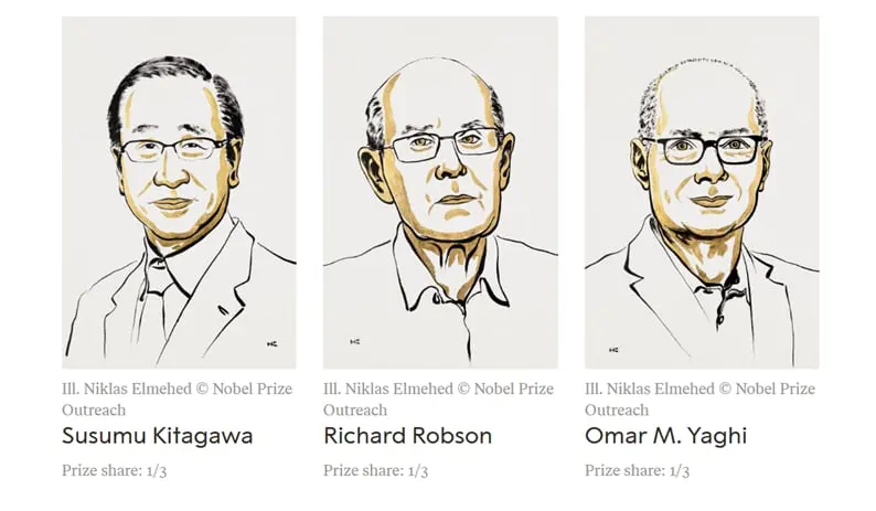 “2025년 노벨 화학상, 금속-유기 골격체(MOF) 개발자 3인에게 수여.”