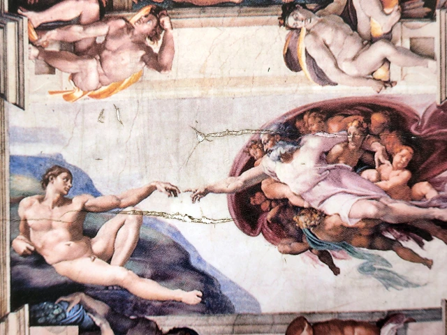 신의 오른손이 아담의 손끝을 향해 뻗어 있다.