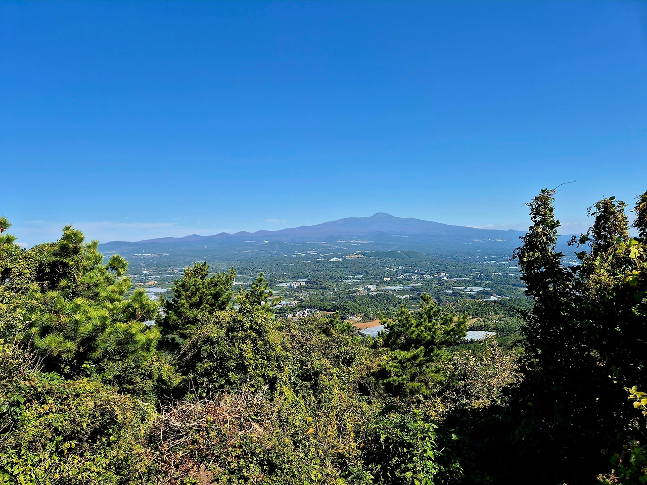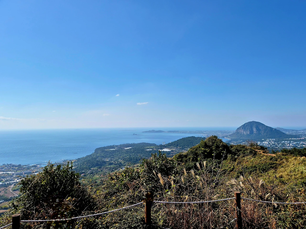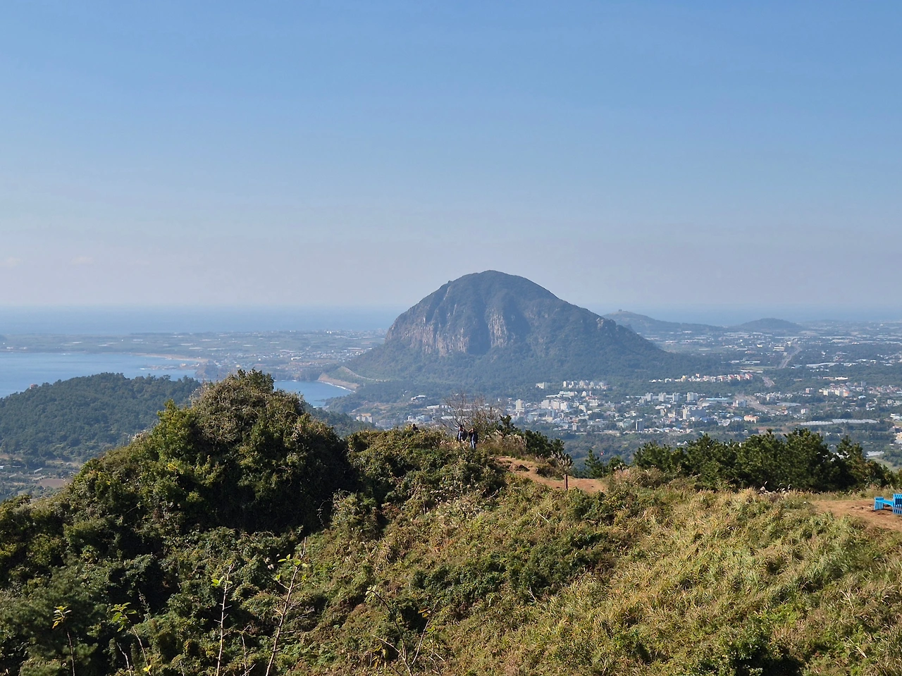 정상에 서면 서귀포의 푸른 바다, 반대편으로는 한라산 능선과 겹겹의 오름들이 펼쳐진다.