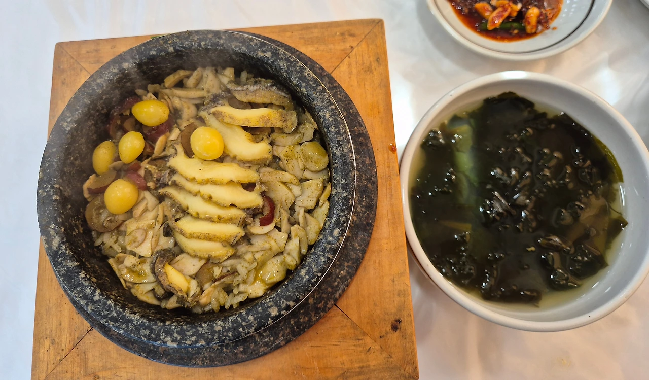 밑반찬 하나하나 정갈했고, 밥알 사이로 전복살이 쫀득하게 씹혔다.