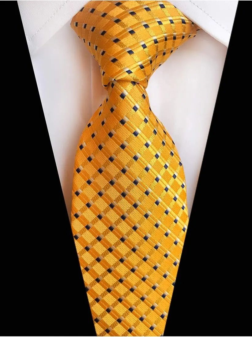 감색 정장, 흰 셔츠, 노란 넥타이.