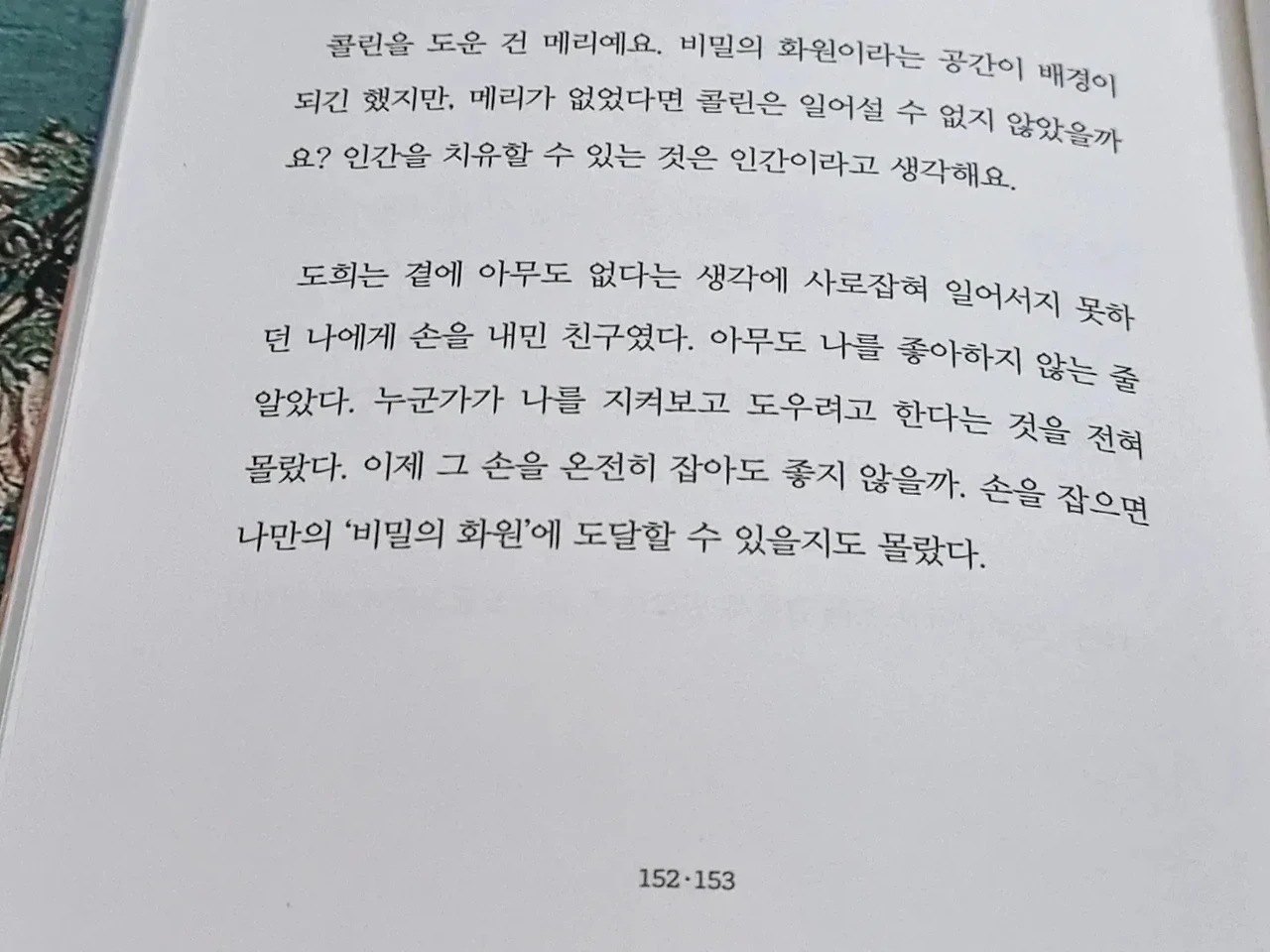 - 그리고 마지막은 도희였다. 달그네인 도희. 플나나 농장에서 도희가 <비밀의 화원>에 대해 말하던 것이 떠올랐다. 콜린을 도운 건 메리예요. 비밀의 화원이라는 공간이 배경이 되긴 했지만, 메리가 없었다면 콜린은 일어설 수 없지 않았을까요? 인간을 치유할 수 있는 것은 인간이라고 생각해요. 도희는 곁에 아무도 없다는 생각에 사로잡혀 일어서지 못하던 나에게 손을 내민 친구였다. 아무도 나를 좋아하지 않는 줄 알았다. 누군가가 나를 지켜보고 도우려고 한다는 것을 전혀 몰랐다. 이제 그 손을 온전히 잡아도 좋지 않을까. 손을 잡으면 나만의 ‘비밀의 화원’에 도달할 수 있을지도 몰랐다. p.152