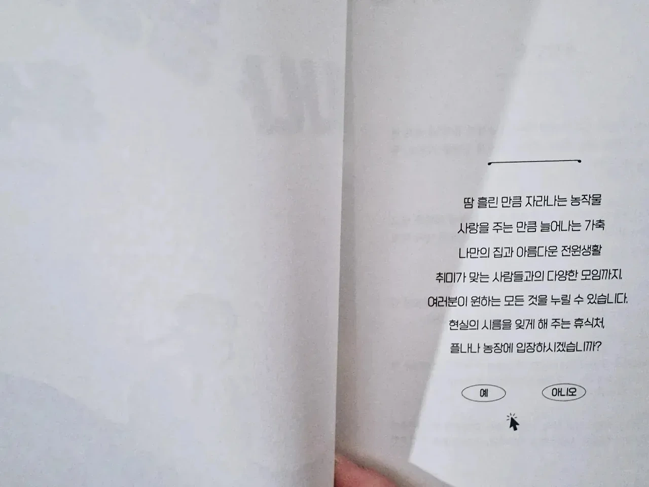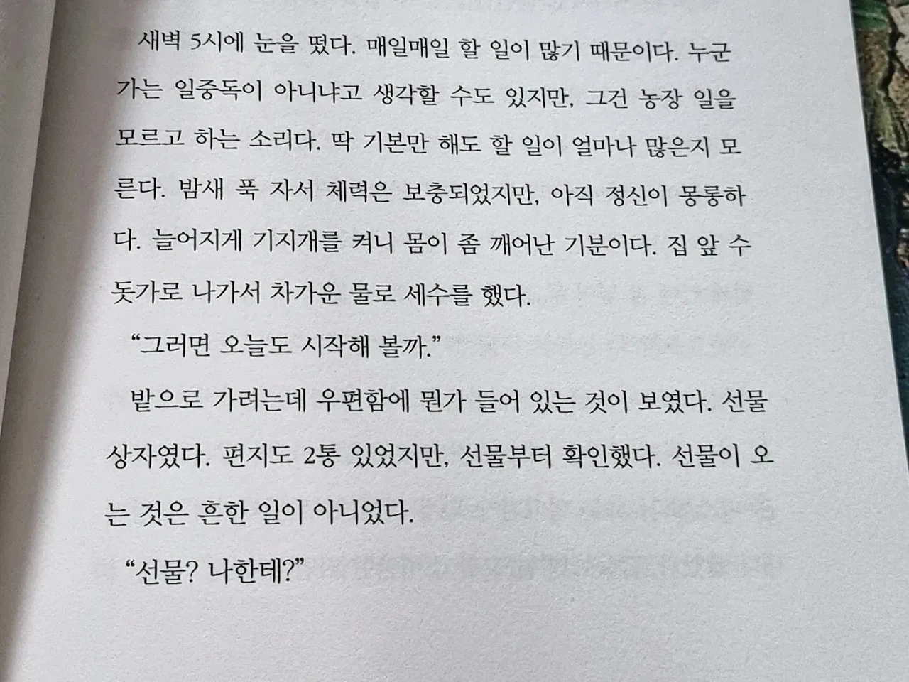 - 새벽 5시에 눈을 떴다. 매일매일 할 일이 많기 때문이다. 누군가는 일중독이 아니냐고 생각할 수도 있지만, 그건 농장 일을 모르고 하는 소리다. 딱 기본만 해도 할 일이 얼마나 많은지 모른다. 밤새 푹 자서 체력은 보충 되었지만, 아직 정신이 몽롱하다. 늘어지게 기지캐를 켜고 몸이 좀 깨어난 기분이다. 집 앞 수돗가로 나가서 차가운 물로 세수를 했다. “그러면 오늘도 시작해 볼까.” p.1