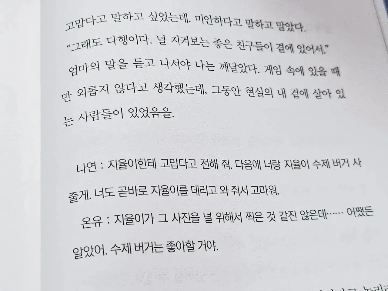 - 여자애들이 많이 하는 게임을 통해 또래로 위장한 다음 접근해서 신상 정보를 알아내고 스토킹하는 식이었다. 그가 지비였던 것이다. 그 사실을 확인하자마자 눈물이 왈칵 쏟아졌다. 배신감과 함께 내가 너무 바보 같았다는 생각에 자책감이 들었다. 게임 속 캐릭터는 누구나 원하는 모습으로 꾸밀 수 있었고, 얼마든지 다른 사람인 척할 수 있다. 그런데 그걸 믿어 버린 것이다. ‘나한테 도대체 왜 그랬어요?’ 물어보고 싶었지만 물어볼 수가 없었다. 대화를 나누면 게임 속 지비가 혹시라도 떠오를까 봐 끔찍했다. 엄마가 달려와 내가 조사를 받을 때 곁에 있었다. 연락할 때까지만 해도 게임 좀 그만하라고 하지 않았느냐는 야단이 쏟아질 줄 알았는데, 엄마는 별말 안했다. 그저 내 손을 꼭 잡아 주었다. 엄마랑 손을 잡은 게 얼마나 오랜만인지 몰랐다. “엄마, 미안해.” 고맙다고 말하고 싶었는데, 미안하다고 말하고 말았다. “그래도 다행이다. 널 지켜보는 좋은 친구들이 곁에 있어서.” 엄마의 말을 듣고 나서야 나는 깨달았다. 게임 속에 있을 때만 외롭지 않다고 생각했는데, 그동안 현실의 내 곁에 살아 있는 사람들이 있었음을. p.150