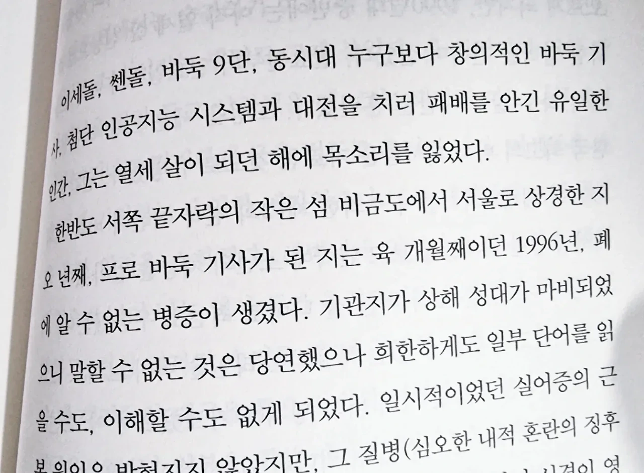 - 이세돌, 쎈돌, 바둑 9단, 동시대 누구보다 창의적인 바둑 기사. 첨단 인공지능 시스템과 대전을 치러 패배를 안긴 유일한 인간, 그는 열 세살이 되던 해에 목소리를 잃었다. 한반도 서쪽 끝자락의 작은 섬 비금도에서 서울로 상경한 지 오년 째, 프로 바둑 기사가 된 지는 육 개월째되던 1996년, 폐에 알 수 없는 병증이 생겼다. 기관지가 상해 성대가 마비되었으니 말할 수 없는 것은 당연했으나 희한하게도 일부 단어를 읽을 수도, 이해할 수도 없게 되었다. 일시적이었던 실어증의 근본 원인은 밝혀지지 않았지만, 그 질병(심오한 내적 혼란의 징후가 아니라 정말 질병이었다면)의 여파로 결국 기관지 신경이 영구적으로 마비됐다. 그래서 그는 지금까지도 장난감 인형에서 나올 법한 독특하고 새되고 밭은 목소리로 말을 한다. - p.323