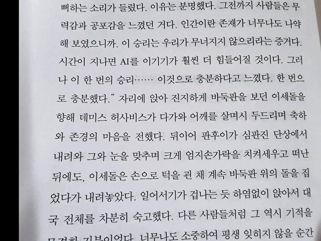 - “알파고의 패배가 확실해지자 사람들의 기뻐하는 소리가 들렸다. 이유는 분명했다. 그전까지 사람들은 무력감과 공포감을 느꼈던 거다. 인간이란 존재가 너무나도 나약해 보였으니까. 이 승리는 우리가 무너지지 않으리라는 증거다. 시간이 지나면 AI를 이기기가 훨씬 더 힘들어 질 것이다. 그러나 이 한 번의 승리...... 이것으로 충분하다고 느꼈다. 한 번으로 충분했다.” 자리에 앉아 진지하게 바둑판을 보던 이세돌을 향해 데미스 허사비스가 다가와 어깨를 살며시 두드리며 축하와 존경의 마음을 전했다. 뒤이어 판후이가 심판진 단상에서 내려와 그와 눈을 맞추며 크게 엄지손가락을 치켜세우고 떠난 뒤에도, 이세돌은 손으로 턱을 괸 채 계속 바둑판 위의 돌을 집었다가 내려놓았다. 일어서기가 겁나는 듯 하염없이 앉아서 대국 전체를 차분히 숙고했다. 다른 사람들처럼 그 역시 기적을 목격한 기분이었다. 너무나도 소중하여 평생 잊히지 않을 순간이었다. p.390