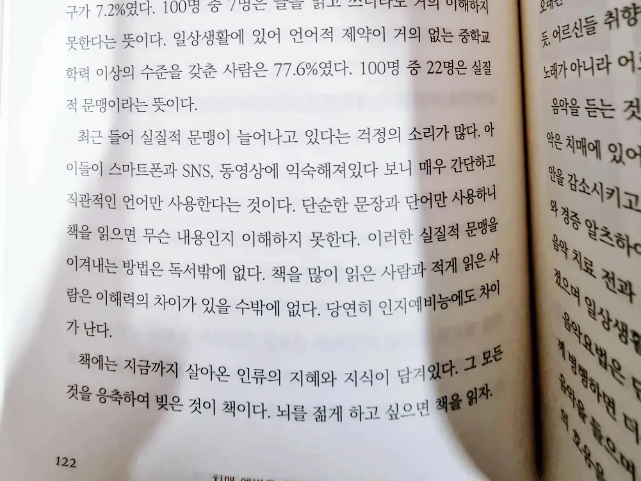 - 최근 들어 실질적 문맹이 늘어나고 있다는 걱정의 소리가 많다. 아이들이 스마트폰과 SNS, 동영상에 익숙해져있다 보니 매우 간단하고 직관적인 언어만 사용한다는 것이다. 단순한 문장과 단어만 사용하니 책을 읽으면 무슨 내용인지 이해하지 못한다. 이러한 실질적 문맹을 이겨내는 방법은 독서밖에 없다. 책을 많이 읽는 사람과 적게 읽은 사람은 이해력의 차이가 있을 수 밖에 없다. 딩연히 인지예비능에도 차이가 난다. 책에는 지금까지 살아온 인류의 지혜와 지식이 담겨있다. 그 모든 것을 응축하여 빚은 것이 책이다. 뇌를 젊게 하고 싶다면 책을 읽자. p.122 - 이 책이 좋은 이유 중 하나는 어렵고 지루한 의학 용어보다 실질적으로 실행할 수있는 치매 건강 팁이 많다는 것이다. 책, 영화, 그림 등의 문화적인 활동의 긍정적인 면과 비만, 고혈압 등의 현대인의 고질병 관리 하면 치매에도 도움이 되며, 더불어 생활 습관에 대해서 체계적으로 정리되어 있어 남녀노소 나이불문 누구나 읽어두면 도움이 될 책이다. 일상의 활력소가 되는 에세이를 출판해주시는 출판사 <푸른 향기>, 감사합니다.