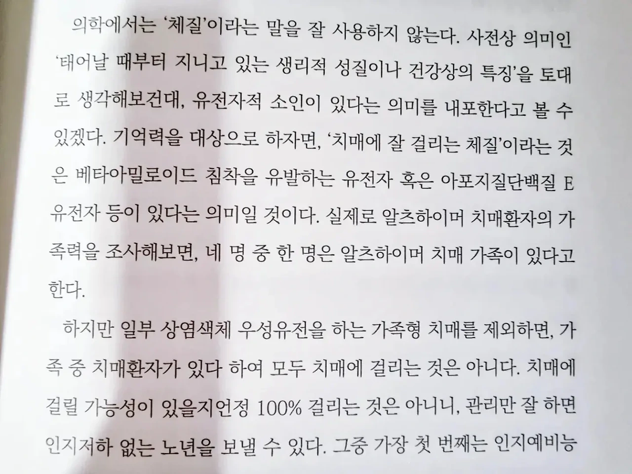 - 의학에서는 ‘체질’ 이라는 말을 잘 사용하지 않는다. 사전상 의미인 ‘태어날 때부터 지니고 있는 생리적 성질이나 건강상의 특징’을 토대로 생각해보건대, 유전자적 소인이 있다는 의미를 내포한다고 볼 수 있겠다. 기억력을 대상으로 하자면, ‘치매에 잘 걸리는 체질’이라는 것은 베타아밀로이드 침착이 유발하는 유전자 혹은 아포지질단백질 E 유전자 등이 있다는 의미일 것이다. 실제로 알츠하이머 치매환자의 가족력을 조사해보면, 네명 중 한 명은 알츠하이머 치매 가족이 있다고 한다. 하지만 일부 상염색체 우성유전을 하는 가족형 치매를 제외하면, 가족 중 치매환자가 있다하여 모두 치매에 걸리는 것은 아니다. 치매에 걸릴 가능성이 있을지언정 100% 걸리는 것은 아니니, 관리만 잘하면 인지저하 없는 노년을 보낼 수 있다. 그 중 가장 첫 번째는 인지예비능이다. 인지예비능이란, 뇌의 네트워크를 강화해 노화를 대비하는 것이다. p.33