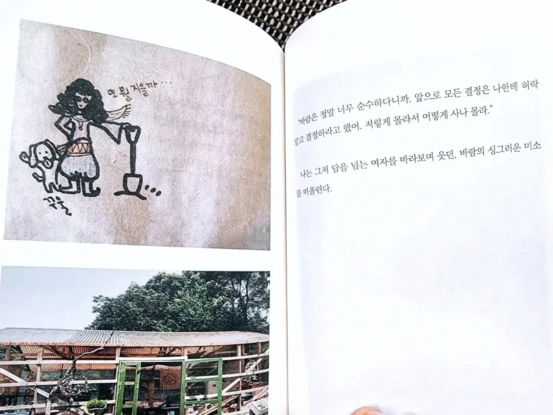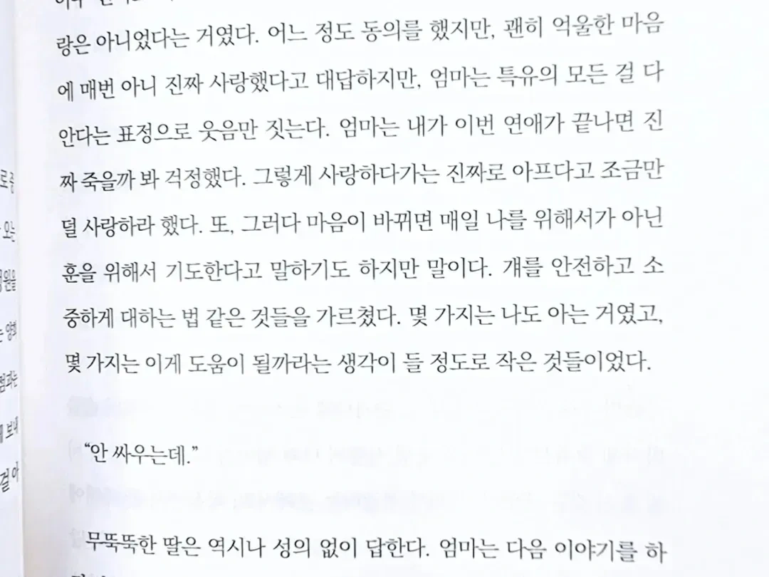 - 엄마의 요즘 주된 관심사는 내 연애인데, 그녀의 말에 의하면 나는 이 연애의 이전까지는 아주 진짜로 푹 빠져서 뜨겁고 불타오르고 헤어지면 죽을 것 같은 사랑은 아니었다는 거였다. 어느 정도 동의를 했지만, 괜히 억울한 마음에 매번 아니 진짜 사랑했다고 대답하지만, 엄마는 특유의 모든 걸 다 안다는 표정으로 웃음만 짓는다. 엄마는 내가 이번 연애가 끝나면 진짜 죽을까 봐 걱정했다. 그렇게 사랑하다가는 진짜로 아프다고 조금만 덜 사랑하라 했다. 또, 그러다 마음이 바뀌면 매일 나를 위해서가 아닌 훈을 위해서 기도한다고 말하기도 하지만 말이다. 걔를 안전하고 소중하게 대하는 법 같은 것들을 가르쳤다. 몇 가지는 나도 아는 거였고, 몇 가지는 이게 도움이 될까라는 생각이 들 정도로 작은 것들이었다. “안 싸우는데.” 무뚝뚝한 딸은 역시나 성의 없이 답한다. 엄마는 다음 이야기를 하지 않으면 못 참는 사람이라 어차피 다음 이야기를 바로 꺼낼 것이다. 사실 엄마에겐 비밀이지만 종종, 그와 싸움이라고 하기엔 썩 다정하고 대화하고 하기엔 밀도 높은 토론에 가까운 무언가를 한다. p.53