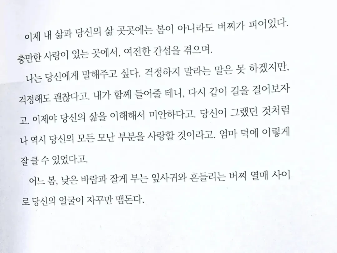- 나는 당신에게 말해주고 싶다. 걱정하지 말라는 말은 못 하겠지만, 걱정해도 괜찮다고. 내가 함께 들어줄 테니, 다시 같이 길을 걸어보자고. 이제야 당신의 삶을 이해해서 미안하다고. 당신이 그랬던 것처럼 나 역시 당신의 모든 모난 부분을 사랑할 것이라고. 엄마 덕에 이렇게 잘 클 수 있었다고. 어느 봄, 낮은 바람과 잘게 부는 잎사귀와 흔들리는 버찌 열매 사이로 당신의 얼굴이 자꾸만 맴돈다. p.21