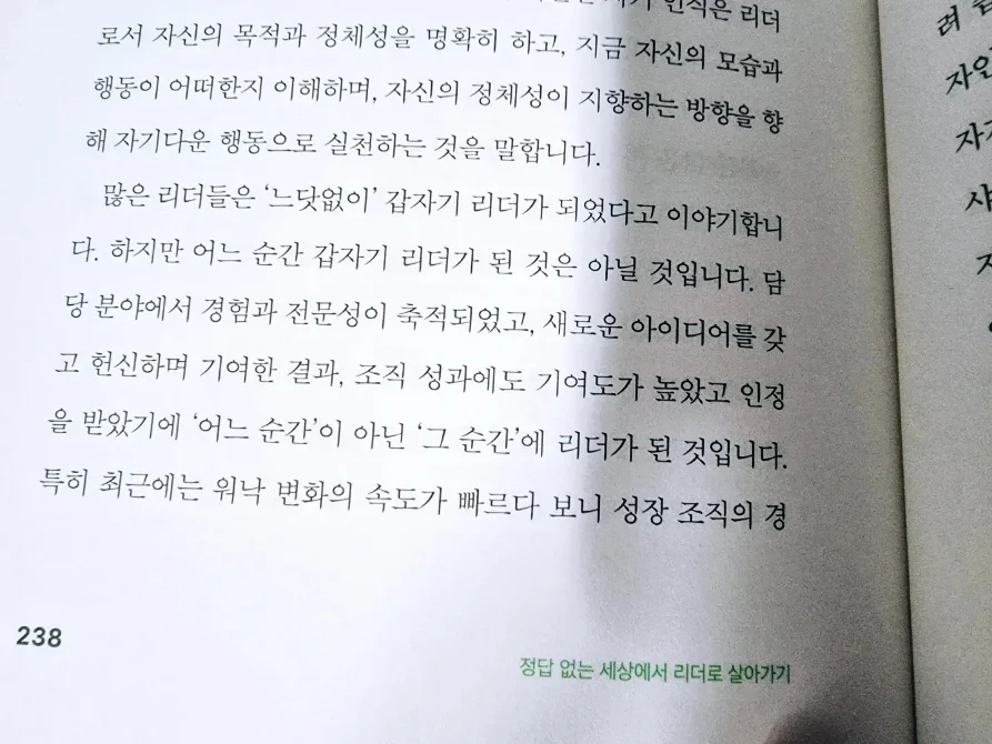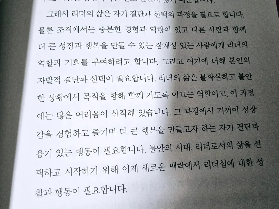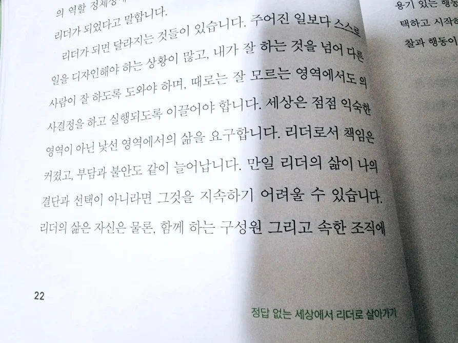- 리더가 되면 달라지는 것들이 있습니다. 주어진 일보다 스스로 일을 디자인해야 하는 상황이 많고, 내가 잘하는 것을 넘어 다른 사람이 잘 하도록 도와야 하며, 때로는 잘 모르는 영역에서도 의사결정을 하고 실행하도록 이끌어야 합니다. 세상은 점점 익숙한 영역이 아닌 낯선 영역에서 삶을 요구합니다. 리더로서 책임은 커졌고, 부담과 불안도 같이 늘어납니다. p.22