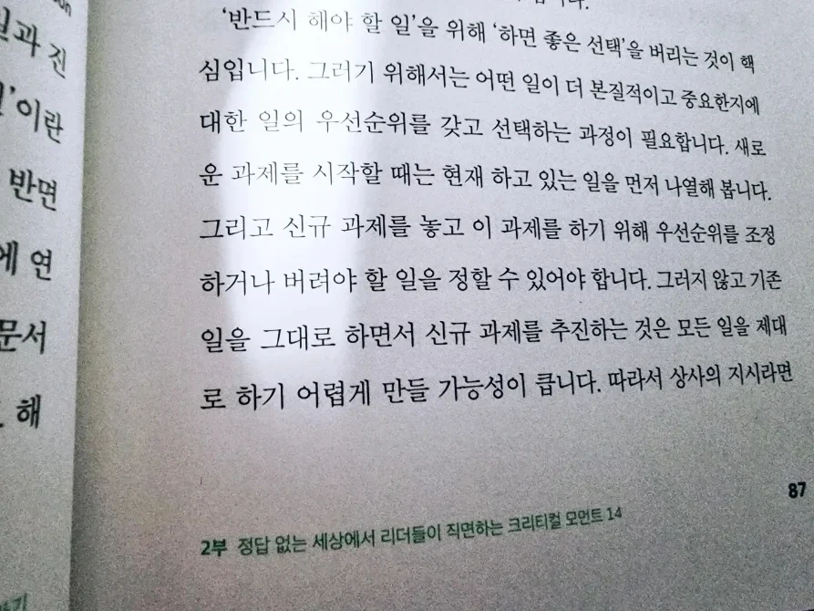 - 새로운 과제를 시작할 때는 현재 하고 있는 일을 먼저 나열해 봅니다. 그리고 신규 과제를 놓고 이 과제를 하기 위해 우선 순위를 조정하거나 버려야 할 일을 정할 수 있어야 합니다. 그러지 않고 기존 일을 그대로 하면서 신규 과제를 추진하는 것은 모든 일을 제대로 하기 어렵게 만들 가능성이 큽니다. p. 87 - 하지만 어느 순간 갑자기 리더가 된 것은 아닐 것입니다. 담당 분야에서 경험과 전문성이 축적되었고, 새로운 아이디어를 갖고 헌신하며 기여한 결과, 조직 성과에도 기여도가 높았고 인정 받았기에 ‘어느 순간’이 아닌 ‘그 순간’에 리더가 된 것 입니다. p.238 - 리더십을 발휘한다는 것은 리더와의 대화를 통해 구성원이 더 가치있고 의미있는 목적과 결과를 향해 실천하도록 이끄는 것을 말합니다. 우리는 리더의 리더십 발휘를 통해 구성원이 일의 목적과 의미를 인식하고 몰입하게 되기를 기대합니다. 또한 구성원은 일을 통해 성장 체험을 하며 담당하는 과제의 수많은 문제를 해결하고 생산적 가치를 만들 수 있어야 합니다. 이 모든 과정은 결국 리더와의 의미있는 대화를 통해 구성원이 체험하고 현실화되어야 하는 과정입니다. 그래서 21세기 기업을 이끄는 운영 시스템이 곧 ‘대화’라고 합니다. 우리가 기업을 새롭게 혁신하는 가장 좋은 방법은 리더의 언어 수준, 즉 대화의 질을 혁신하는 것 입니다. p.279 - 어떤 조직 사회에 리더가 없다면? 상상할 수 없는 일. 작은 집단에서 사회 조직까지 책임감 있고 강단있는 리더는 늘 필요하다. 이 책을 읽으면서 다시금 사회적 구도와 조직 형태에 대해 생각해본다. 학교라는 집단, 두 사람 이상이 모여 만든 모임, 중소기업, 대기업, 지역, 국가 그 모든 곳에는 리더가 있고, 리더에게는 선택과 결정의 주도권이 주어진다. 리더십은 곧 결단력과 책임감인데 그것의 시작은 노력과 실행력 이라고 생각한다. 좋은 리더가 되기 위해서는 먼저 '나 자신'의 인생에서 일어나는 선택과 결정을 잘 해야하고, 스스로 맡은바 최선을 다하며 사회가 필요로 하는 사람이 되도록 한다고 생각한다. 어제보다 오늘의 배움이 크고, 오늘보다 내일이 성장하는 당신의 삶을 응원한다.