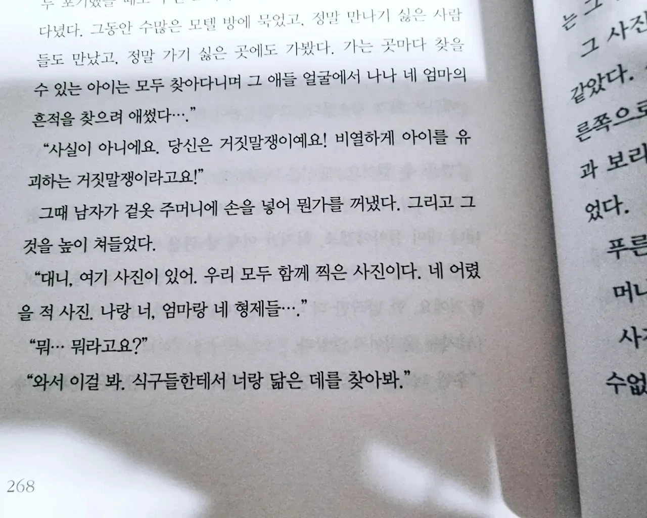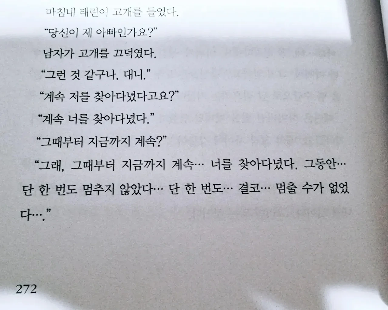 - “왜 저를 찾지 않았어요? 왜 안 찾았냐고요!” “경찰서에 신고했고, 우리도 직접 찾아다녔다. 다른 사람들이 모두 포기했을 때도 우린 포기하지 않았어. 오랫동안 난 너를 찾아다녔다. 그동안 수많은 모텔 방에 묵었고, 정말 만나기 싫은 사람들도 만났고, 정말 가기 싫은 곳에도 가봤다. 가는 곳마다 찾을 수 있는 아이는 모두 찾아다니며 그 애들 얼굴에서 나나 네 엄마의 흔적을 찾으려 애썼다.” “사실이 아니에요. 당신은 거짓말쟁이예요! 비열하게 아이를 유괴하는 거짓말쟁이라고요!” p.268