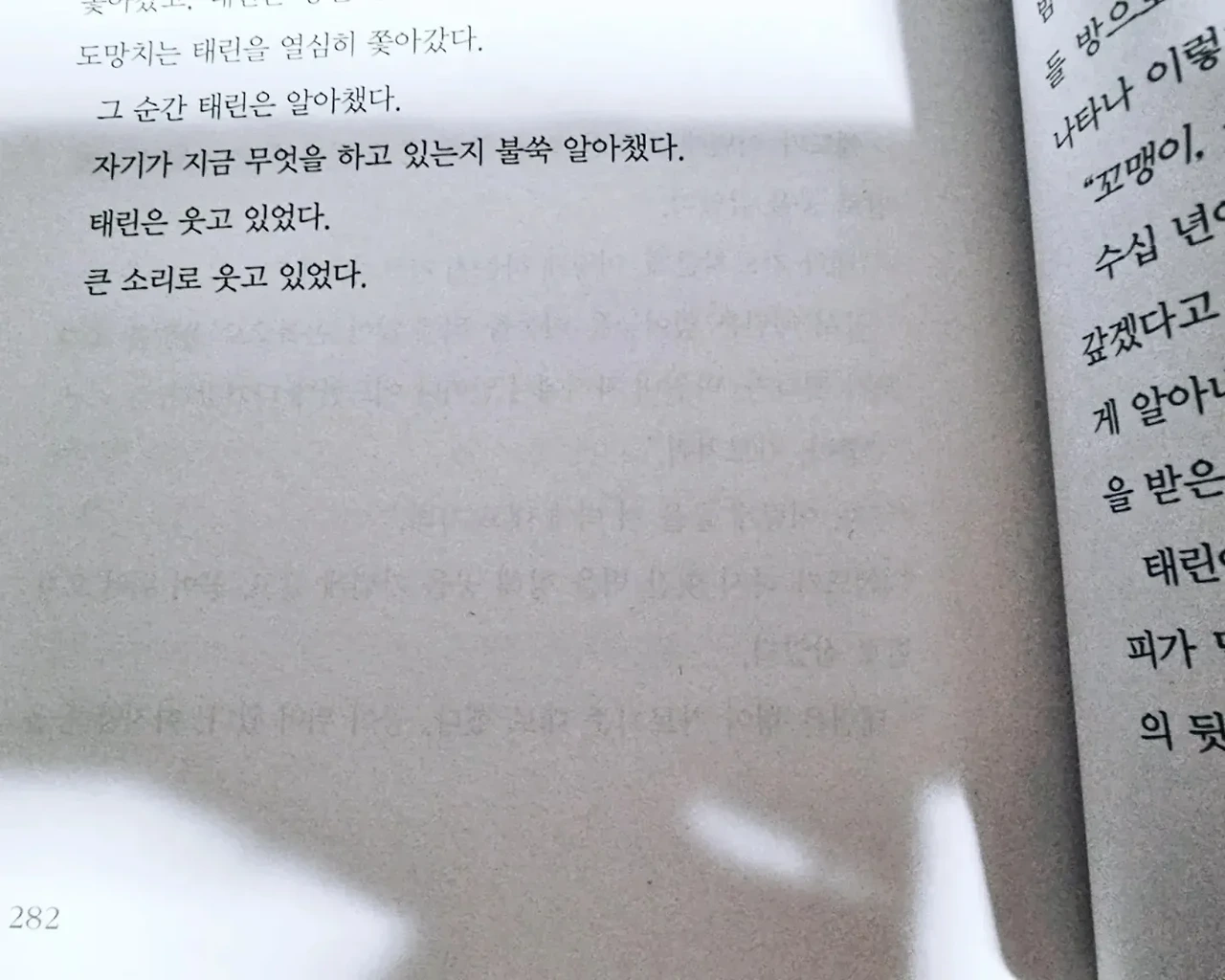 - 태린은 다시 공을 찼다. 헛간 벽에 맞은 공이 튀어 왔고, 형제는 그 공을 먼저 잡으려고 쫓아갔다. 공을 두고 다투는 사이, 둘의 다리가 뒤얽히고 둘의 몸이 쾅쾅 부딪쳤다. 에드가 먼저 공을 잡았지만 태린이 쫓아가 공을 빼앗았다. 그러자 이번에는 에드가 태린을 쫓아갔고, 태린은 공을 몰고 마당을 가로질러 도망쳤다. 애드는 도망치는 태린을 열심히 쫓아갔다. 그 순간 태린은 알아챘다. 자기가 지금 무엇을 하고 있는지 불쑥 알아챘다. 태린은 웃고 있었다. 큰 소리로 웃고 있었다. p.282