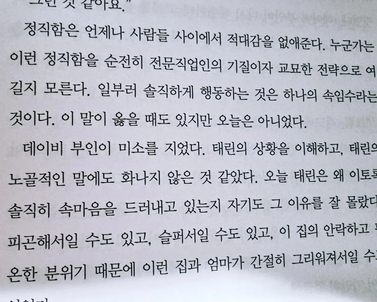 - “정말 미안하다, 태린. 정말 미안해. 나는, 난, 난.” 태린은 앞으로 다가가 엄마를 안고 엄마한테 머리를 기댔다. 그러자 엄마가 태린의 머리를 살살 쓰다듬었다. “엄마 잘못이 아니에요. 난 괜찮아요. 엄마 잘못이 아니에요.” 엄마는 아무 말도 하지 않았다. 계속 태린을 꼭 껴안고서 태린의 머리를 쓰다듬기만 했다. 엄마한테서는 태린이 기억하고 있는 그 냄새가 났다. 정말 똑같았다. p.280