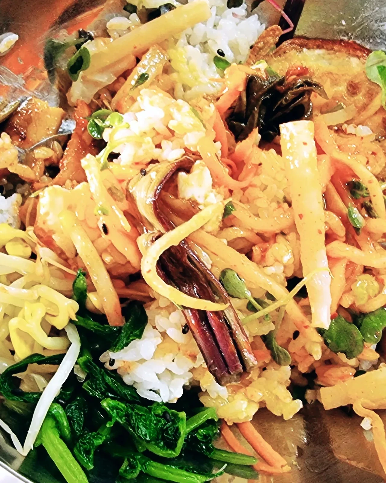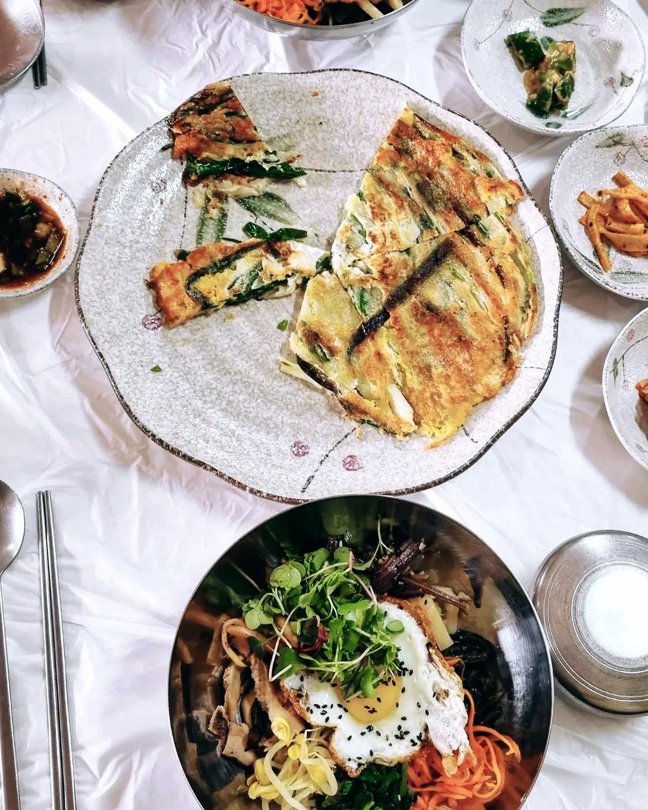 - 이맘 때 사찰에 가면 산채비빔밥을 즐겨 먹는다. 봄 기운이 느껴지는 산나물과 콩나물, 고사리, 시금치, 당근, 무순, 표고버섯 등, 거기에다 달걀 후라이와 고추장을 얻어주면 세상을 다가진 맛이다. 비빔밥이 맛있는 건 모두가 아는 사실. 산채비빔밥은 봄기운을 받아 건강해지는 느낌이어서 즐겨먹는데, 구례 화엄사에서 산채비빔밥 맛집을 찾았다. 산나물 밥상 이라는 상호 명이 마음에 들었고, 맛은 그 이상이었다. 거기에 봄비가 내리던 시점 뜨끈한 파전 한접시에 감동이 몰려왔다.(술을 못하는 내가 막걸이를 먹어볼까 고민하게 하는 맛_ 천성적으로 술 해독이 어려워서 패스) 맛있게 식사하던 도중 갑자기 우두두 우박이 쏟아져 신기한 경험을 한 것도, 아름다운 구례의 봄, 화엄사의 위대한 가치와 자연의 풍경들, 천연기념물로 지정된 덜핀 홍매화도 그 모든 순간이 봄의 기운처럼 뜻깊은 시간이었다.