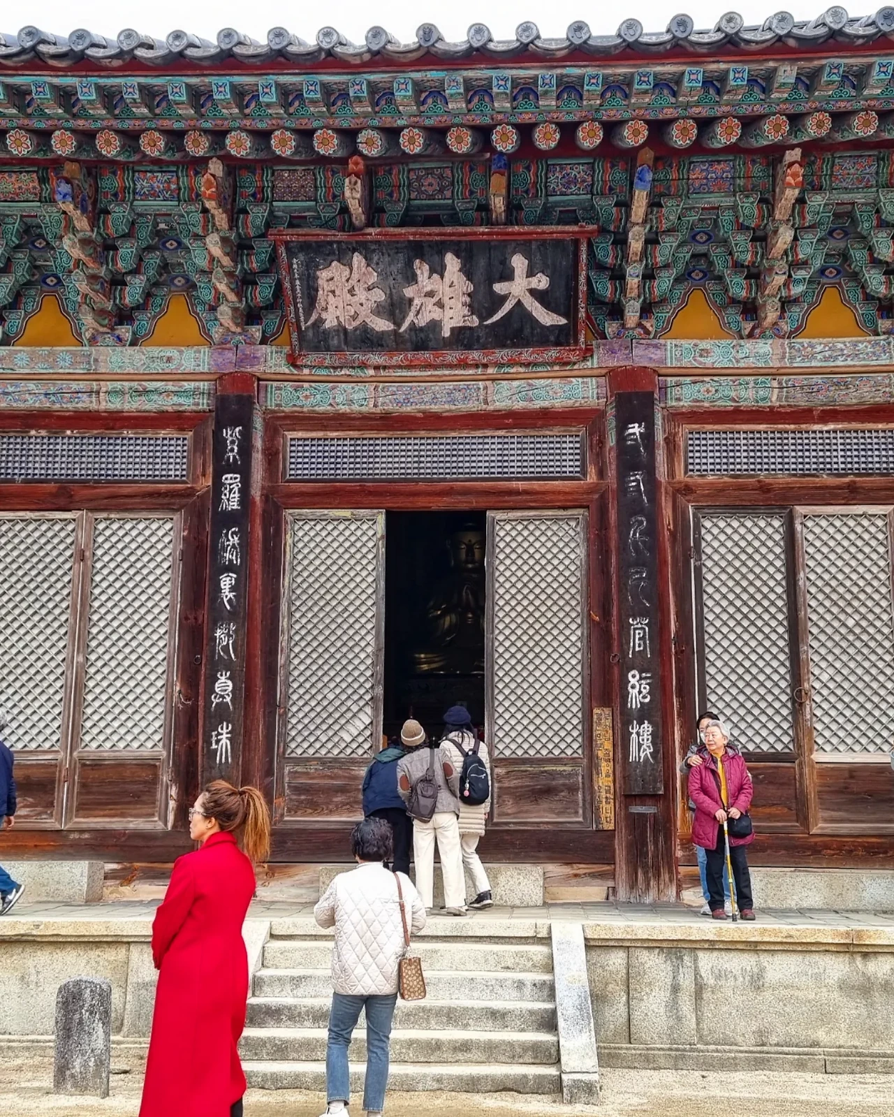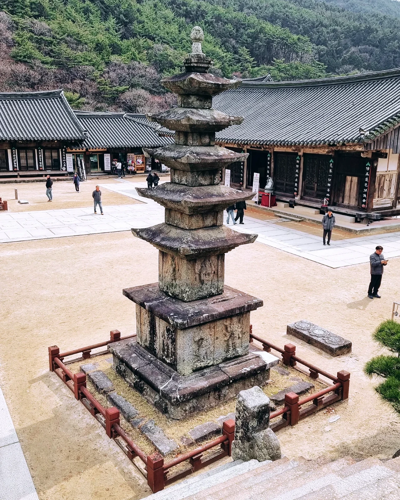 사찰 내에는 각황전을 비롯하여 국보 4점, 보물 5점, 천연기념물 1점, 지방문화재 2점 등 많은 문화재와 20여동의 부속 건물이 배치되어 있다. 특히 건물의 배치에 있어서는 일주문을 지나 약 30˚꺾어서 북동쪽으로 들어가면 금강역사, 문수, 보현의 상을 안치한 천왕문에 다다르는데 이 문은 금강문과는 서쪽 방향으로 빗겨 놓은 것이 독특한 특징이다. 이 천왕문을 지나 다시 올라가면 보제루에 이르고 보제루는 다른 절에서 그 밑을 통과하여 대웅전에 이르는 방법과는 다르게 누의 옆을 돌아가게 되어 있다. 절내에서는 동.서 두개의 탑이 사선 방향으로 보이며 동측탑의 윗부분보다 한단 높은 더위에 대웅전이 있고 서쪽탑의 윗부분에는 각황전이 위치하고 있다.