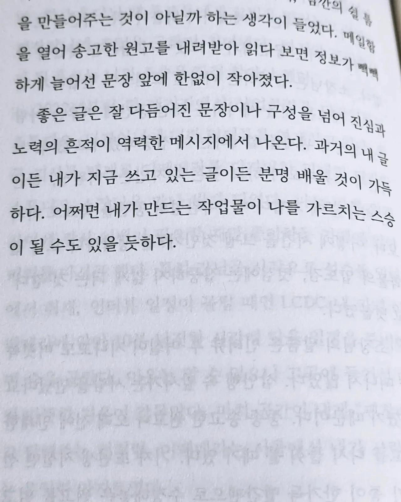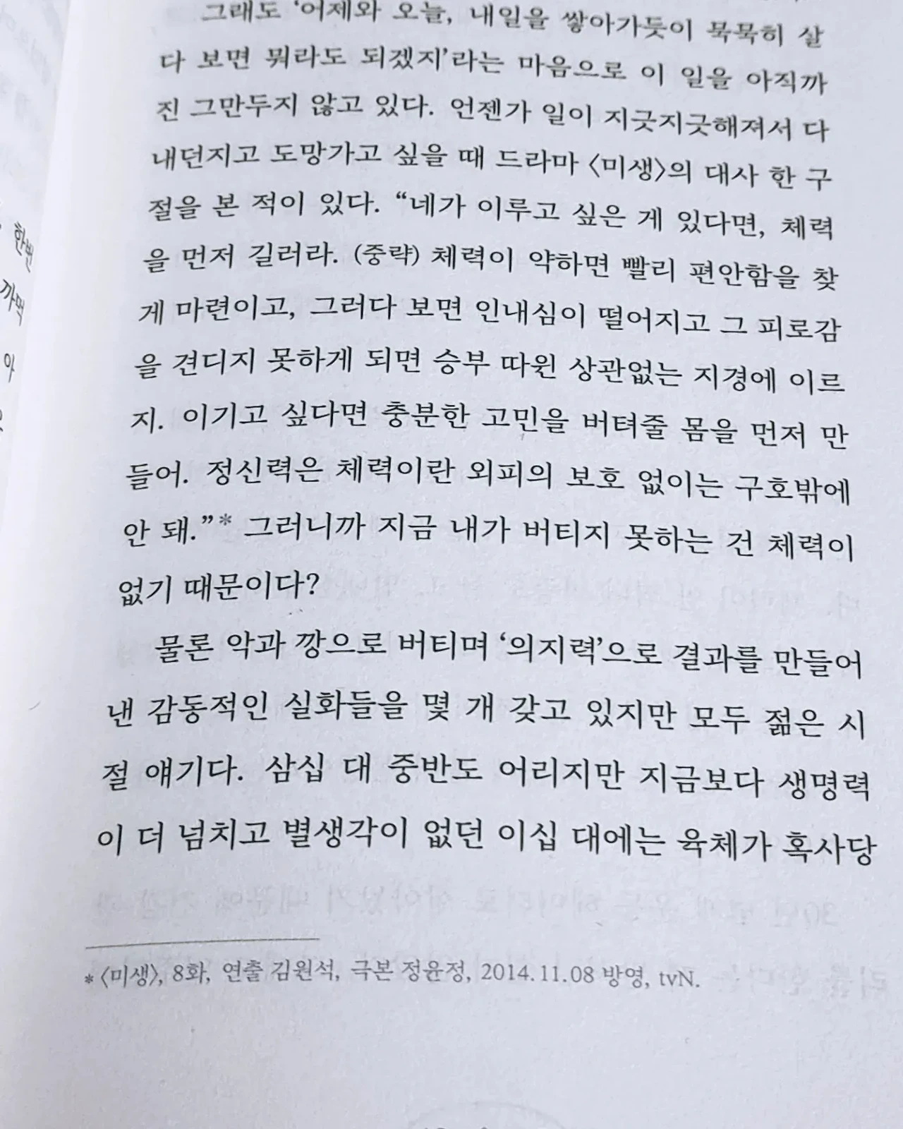 - 마감이 끝을 향할수록 밤새우는 날도 허다하다. 부모님을 비롯한 주변 사람들은 컴퓨터 앞에 앉아 타자만 치면 되니 내 일이 힘들지 않을 거라 생각한다. 하지만 실제로 해보면 다들 알 테지만, 똑같은 짓을 매달 반복하다 보면 웬만한 체력으로도 도저히 견뎌낼 수 없다. 그래도 ‘어제와 오늘, 내일을 쌓아가듯이 묵묵히 살다 보면 뭐라도 되겠지’라는 마음으로 이 일을 아직까지 그만두지 않고 있다. 언젠가 일이 지긋지긋해져서 다 내던지고 도망가고 싶을 때 드라마 <미생>의 대사 한 구절을 본 적이 있다. “네가 이루고 싶은 게 있다면, 체력을 먼저 길러라. (중략) 체력이 약하면 빨리 편안함을 찾게 마련이고, 그러다 보면 인내심이 떨어지고 그 피로감을 견디지 못하게 하면 승부 따윈 상관없는 지경에 이르지. 이기고 싶다면 충분한 고민을 버텨줄 몸을 먼저 만들어. 정신력은 체력이란 외피의 보호 없이는 구호밖에 안돼.” p.48-49