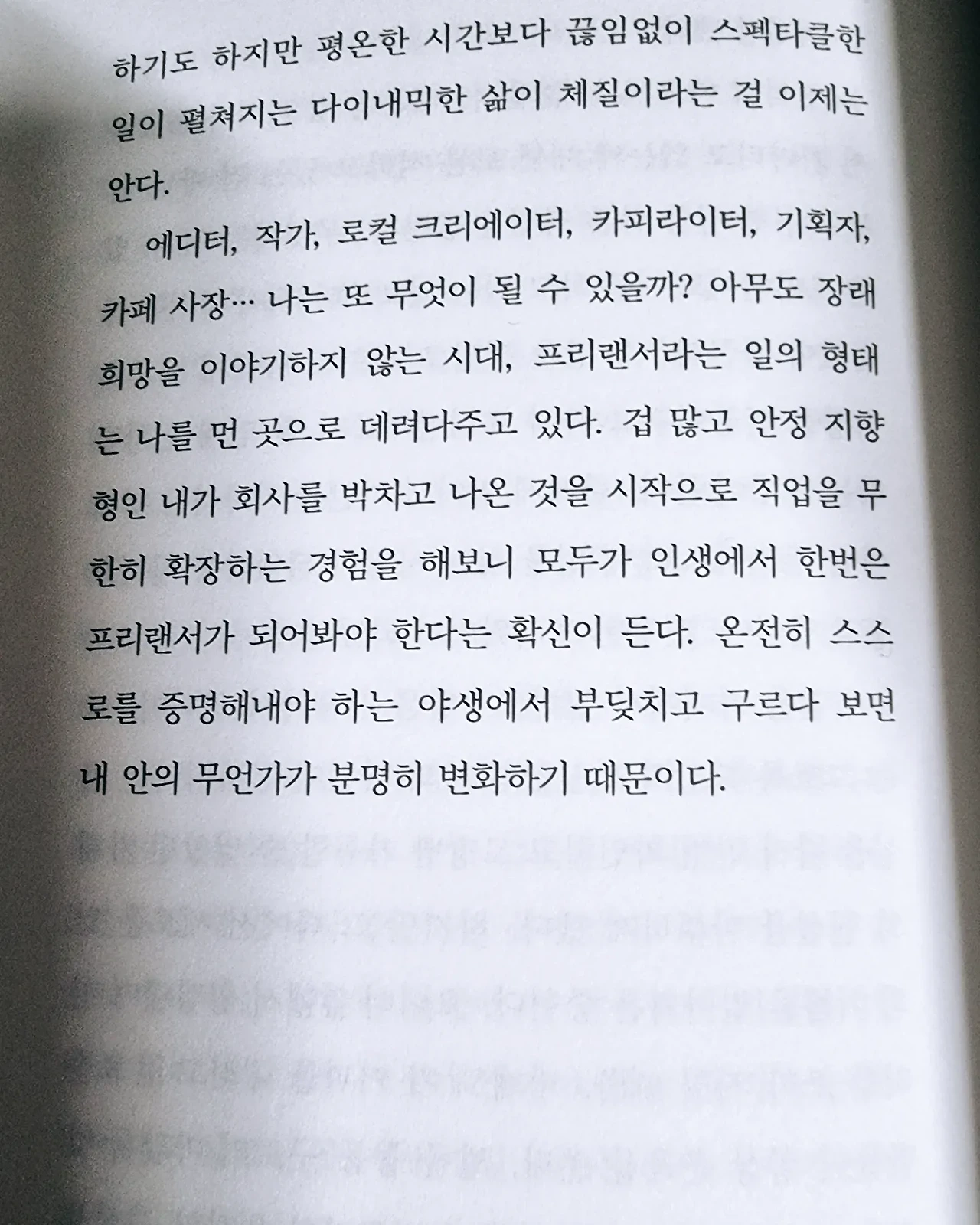 - 아무도 장래희망을 이야기하지 않는 시대, 프리랜서라는 일의 형태는 나를 먼 곳으로 데려다주고 있다. 겁 많고 안정 지향형인 내가 회사를 박차고 나온 것을 시작으로 직업을 무한히 확장하는 경험을 해보니 모두가 인생에서 한번은 프리랜서가 되어봐야 한다는 확신이 든다. 온전히 스스로를 증명해내야 하는 야생에서 부딪치고 구르다 보면 내 안의 무언가가 분명히 변화하기 때문이다. p.234 - 과거엔 프리랜서하면, 비정규직, 배고픈 직업을 떠올렸지만, 현 시대는 다르다. 프리랜서의 시대이다. 작가, 디자이너, 카피라이터, 감독, 배우, 유튜버 등 예술과 문화 분야의 직업군은 대부분 프리랜서라고 할 수 있다. 책을 읽고나서 다시금 깨닫는다. 무수히 많은 직업이 있지만, 내가 좋아하는 글을 쓰고 좋아하는 사람을 만나고 좋아하는 일을 할 수 있는 작가라는 직업을 오래토록 사랑하며 살아가겠노라고. 오늘도 어디선가 무언가를 창작하고 계실 대한민국 프리랜서들이여, 파이팅! - 좋은 책을 협찬 해 주신 출판사 <자이언트 북스> 감사합니다.