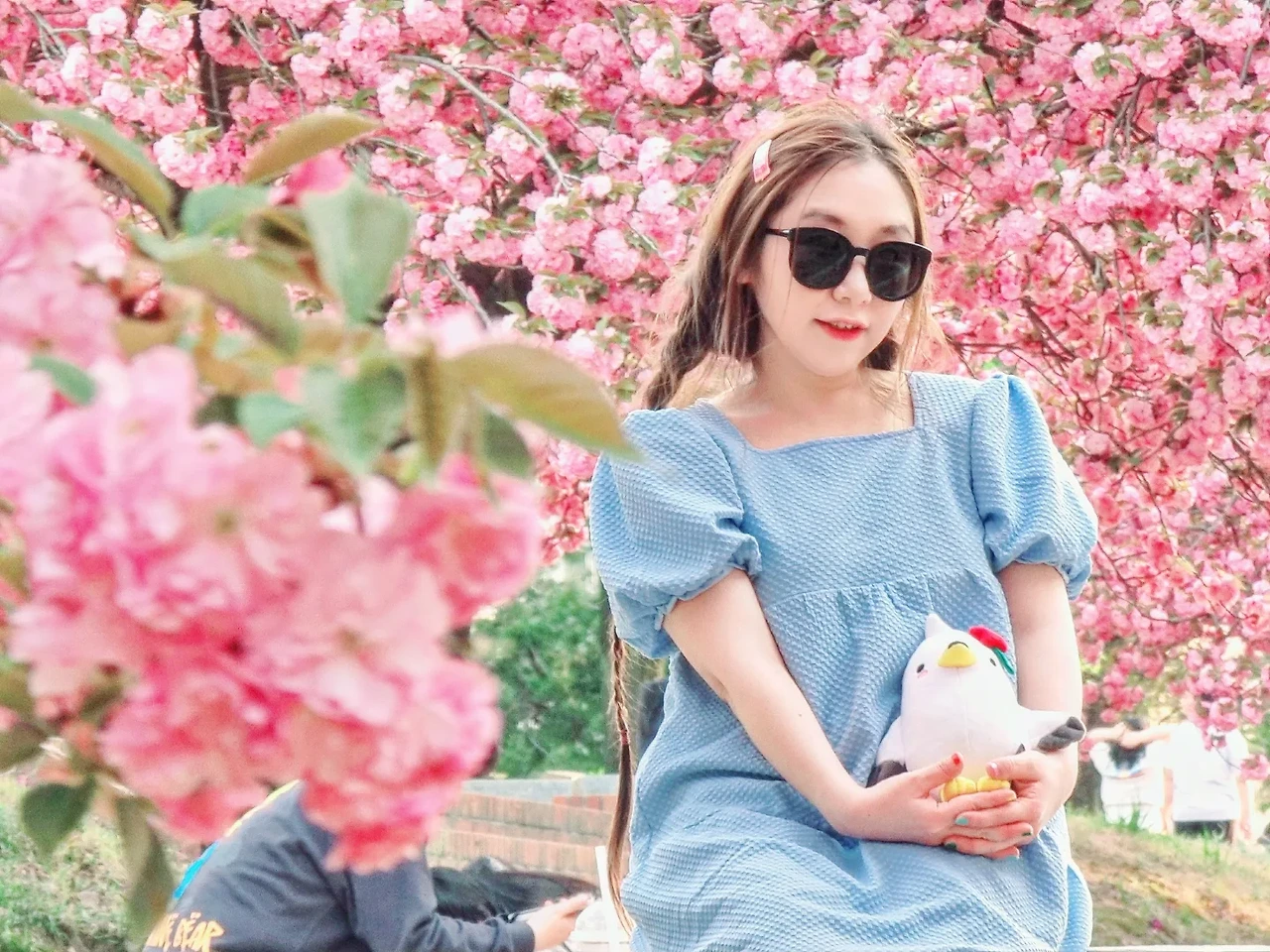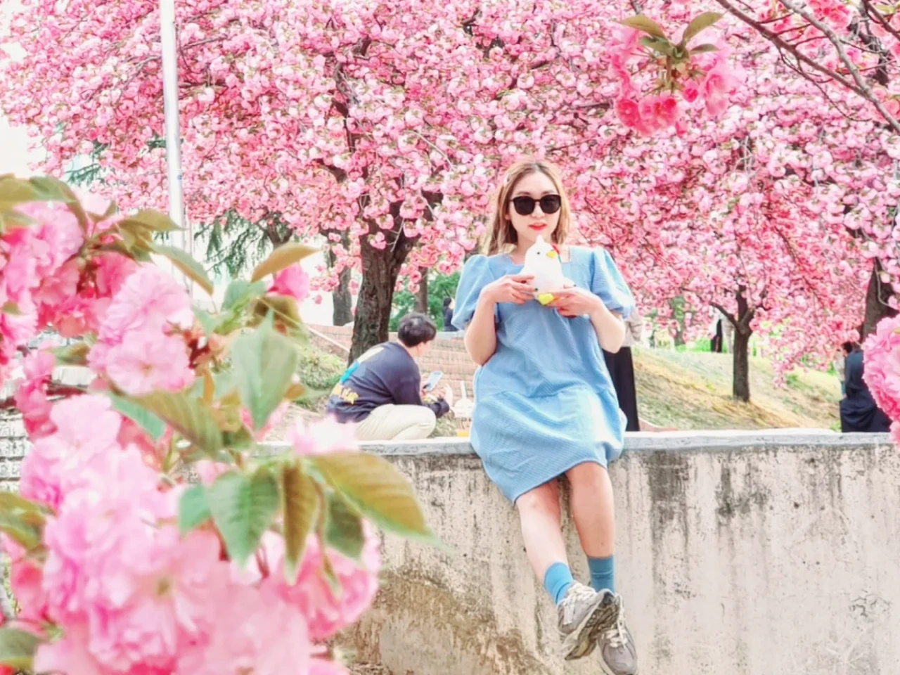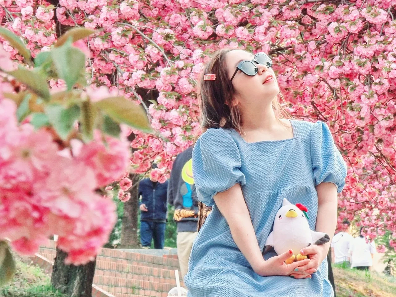 봄의 꽃을 보며 웃음꽃을 피우는