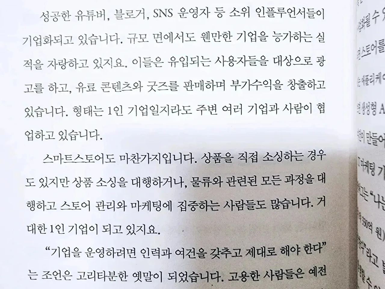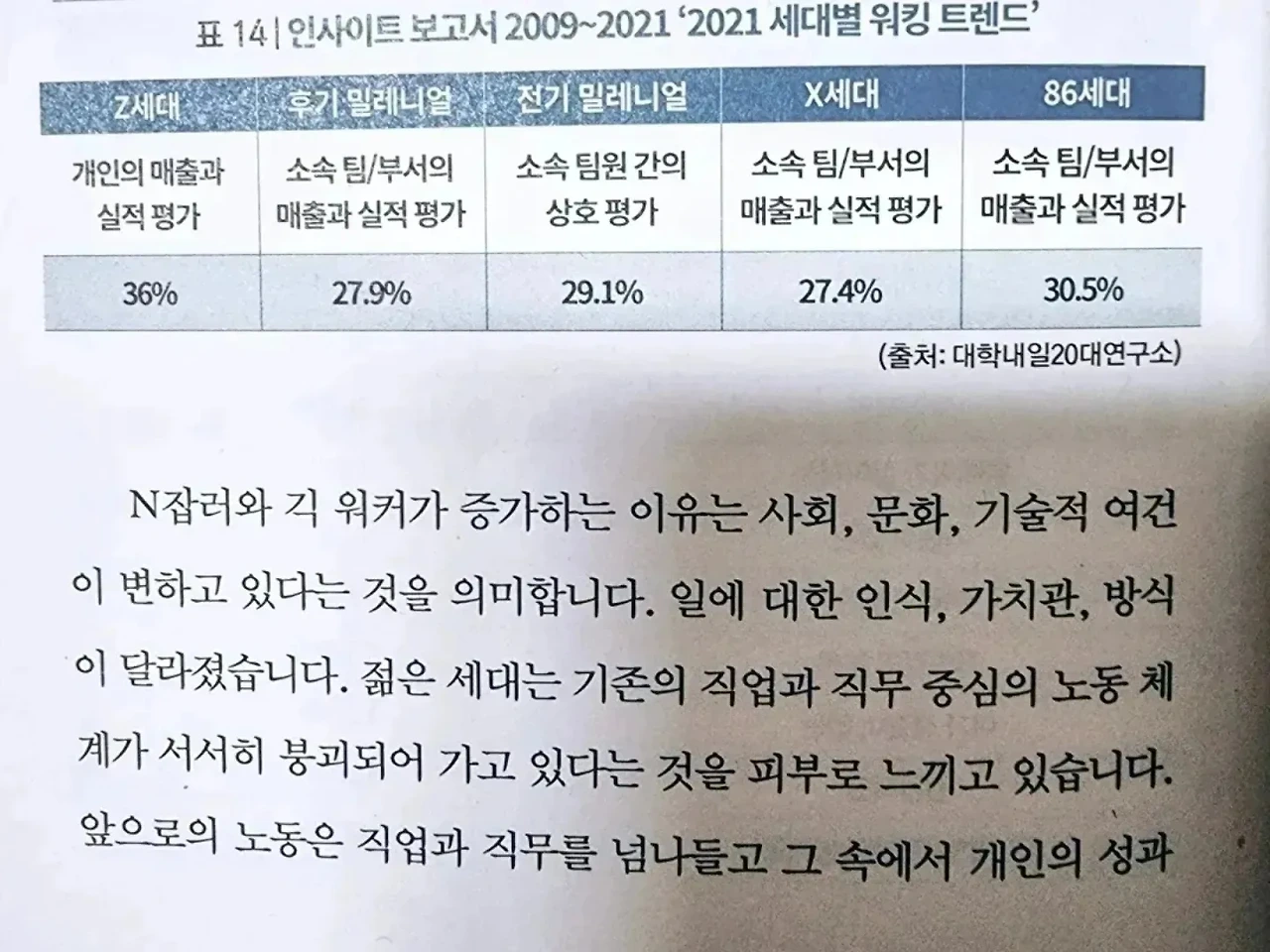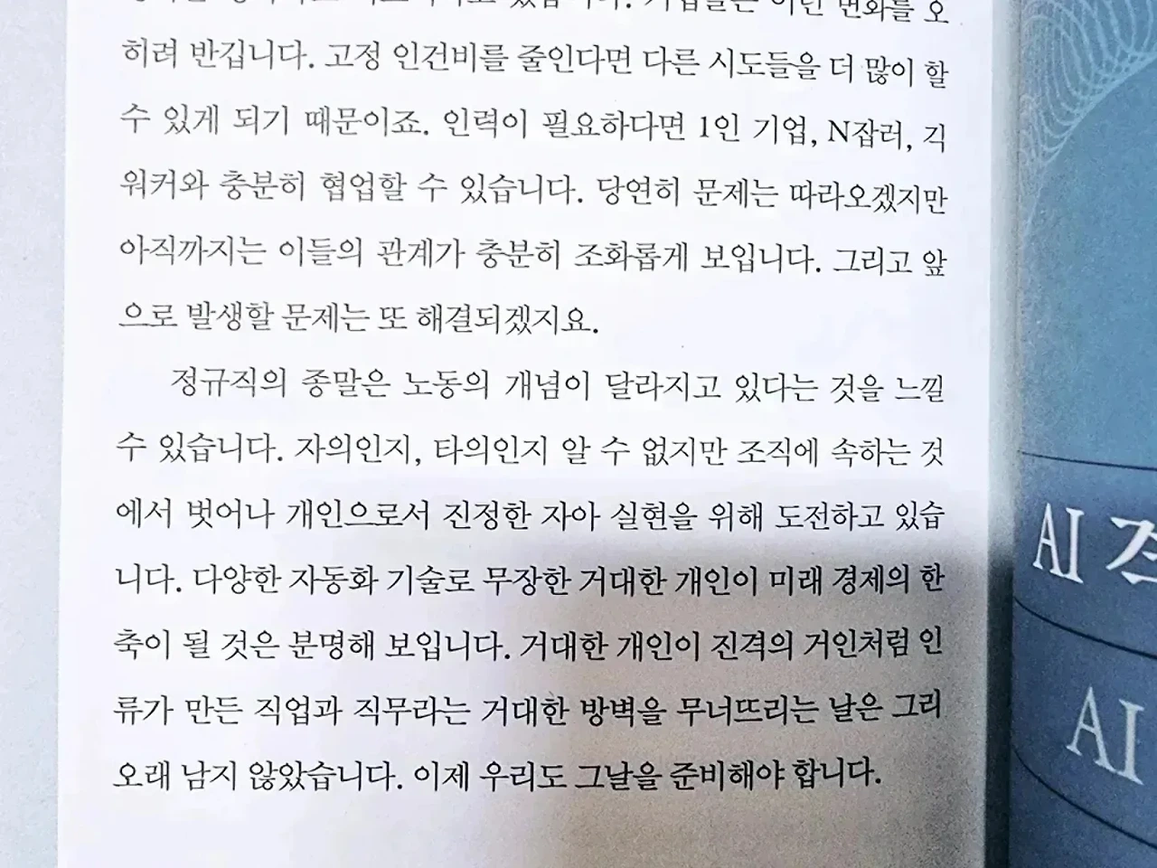 - 과거에는 본업만 신경 쓰는 것도 벅찼는데, 최근 워라밸을 중시하는 사회문화가 확산되었습니다. 또 자동화 기술 발달로 같은 양의 일도 빠르게 끝낼 수 있게 되었기 때문입니다. 유연근무, 재택근무, 주 4일 근무 등 다양한 근무 방식이 도입되면서 근무시간 외에 시간을 어떻게 활용하는지에 대한 직장인들의 고민은 계속 늘고 있습니다. 조용한 부업은 직장인들에게 너무나 매력적인 선택지 입니다. p.152 - 정규직의 종말은 이미 시작되었습니다. 정규직은 ‘조용한 부업’을 통해 아주 조용히 정규직으로부터 도망치고 있고, 1인 기업, N잡러와 긱 워커는 당당히 자신의 역량을 세상에 펼치며 스스로 성과를 평가하고 피드백하고 있습니다. 기업들은 이런 변화를 오히려 반깁니다. 고정 인건비를 줄인다면 다른 시도들을 더 많이 할 수 있게 되기 때문이죠. 인력이 필요하다면 1인 기업, N잡러, 긱 워커와 충분히 협업할 수 있습니다. 당연히 문제는 따라오겠지만 아직까지는 이들의 관계가 충분히 조화롭게 보입니다. 그리고 앞으로 발생할 문제는 또 해결되겠지요. 정규직의 종말은 노동의 개념이 달라지고 있다는 것을 느낄 수 있습니다. 자의인지, 타의인지 알 수 없지만 조직에 속하는 것에서 벗어나 개인으로서 진정한 자아 실현을 위해 도전하고 있습니다. p.176