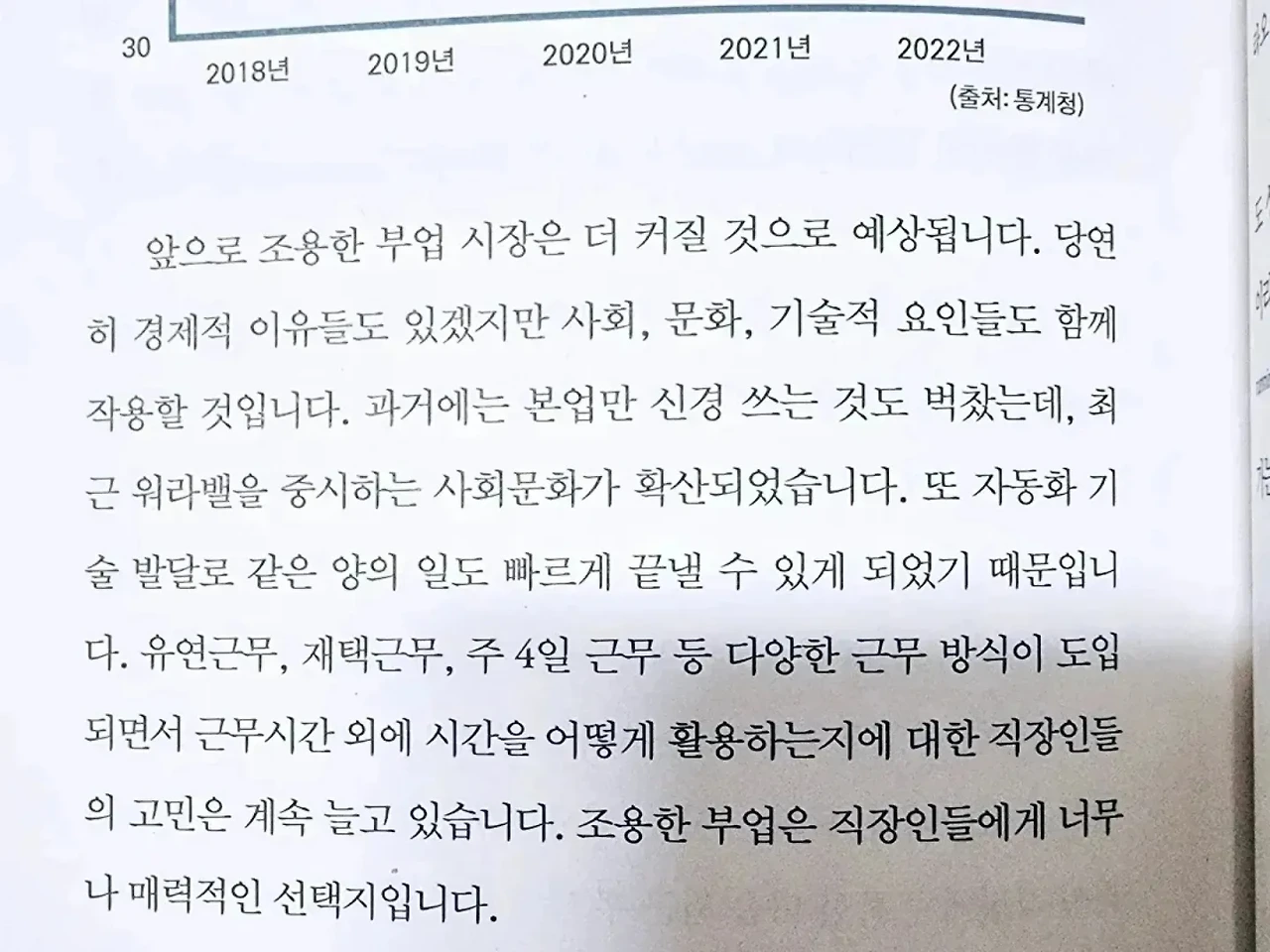 - ‘조용한 부업’이 뜨고 있습니다. 조용한 부업이란 원격근무나 모바일 기기를 이용해 회사에 알리지 않고 다른 일을 병행하는 부업을 말합니다. 우리나라 뿐만 아니라 미국을 포함한 전 세계적인 현상인데요. 팬데믹 이후 원격 근무가 확산되면서 조용한 부업을 하는 직장인들이 늘어났습니다. 경제적으로 저성장이 장기화되고 불확실성이 증가해 직장인들의 연봉도 정체되어 있는 점도 한몫했습니다. p.150