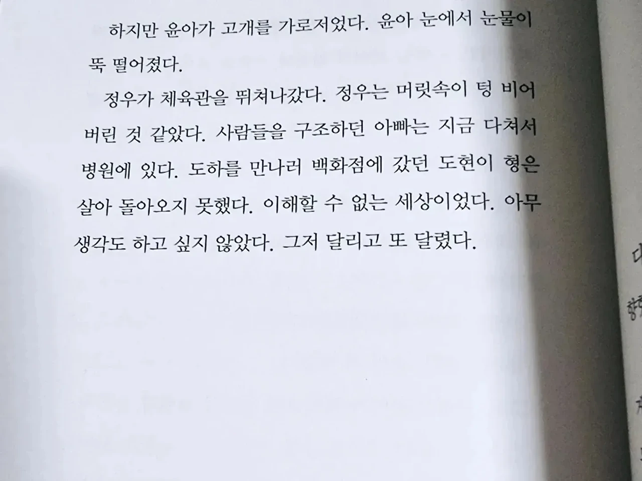 - 하지만 윤아가 고개를 가로저었다. 윤아 눈에서 눈물이 뚝 떨어졌다. 정우가 체육관을 뛰어나갔다. 정우는 머릿속이 텅 비어버린 것 같았다. 사람들을 구조하던 아빠는 지금 다쳐서 병원에 있다. 도하를 만나러 백화점에 갔던 도현이 형은 살아 돌아오지 못했다. 이해할 수 없는 세상이었다. 아무 생각도 하고 싶지 않았다. 그저 달리고 또 달렸다. p.138