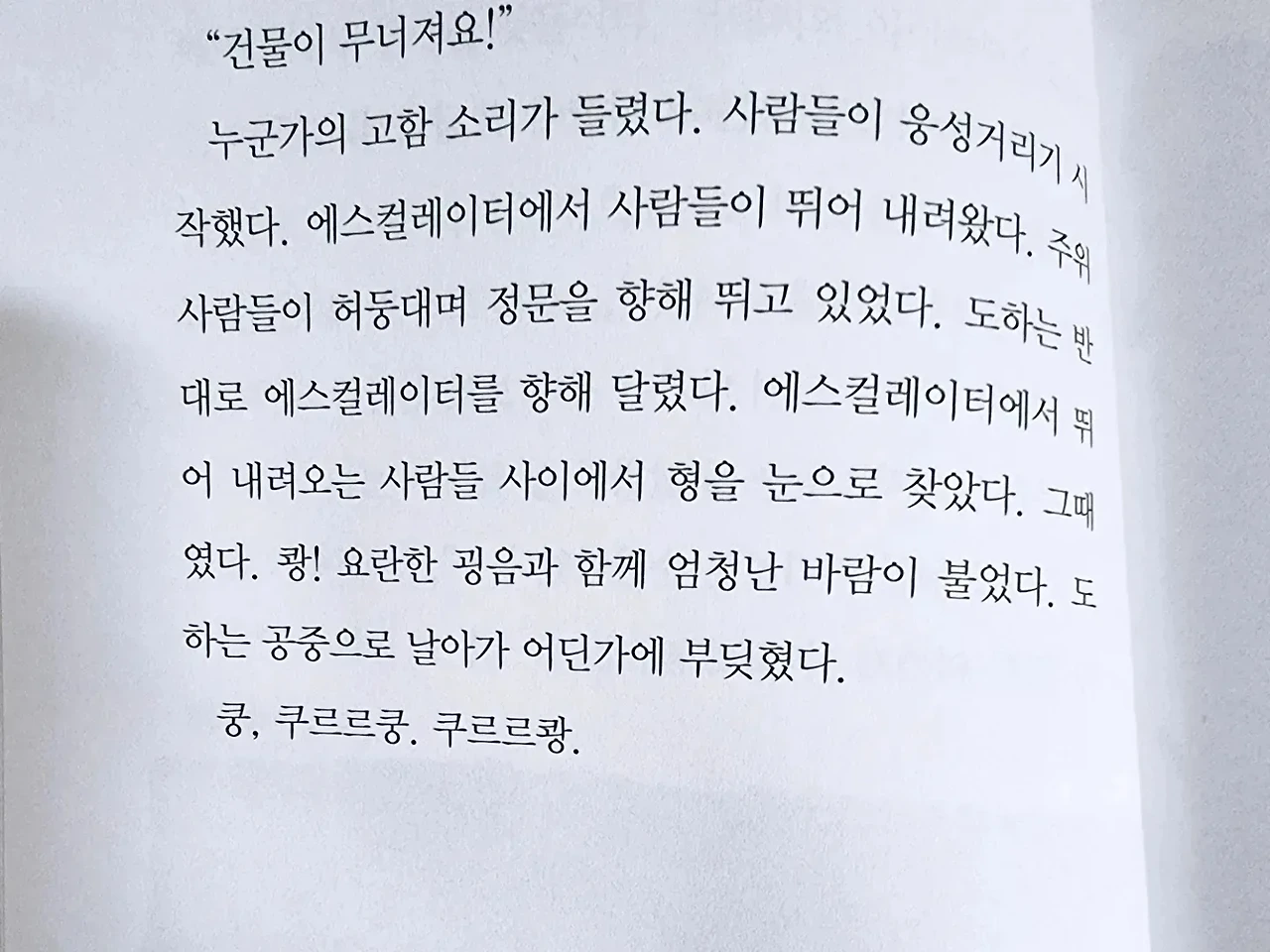 - “건물이 무너져요!” 누군가의 고함 소리가 들렸다. 사람들이 웅성거리기 시작했다. 에스컬레이터에서 사람들이 뛰어 내려왔다. 주위 사람들이 허둥대며 정문을 향해 뛰고 있었다. 도하는 반대로 에스컬레이터를 향해 달렸다. 에스컬레이터에서 뛰어 내려오는 사람들 사이에서 형을 눈으로 찾았다. 그때였다. 쾅! 요란한 굉음과 함께 엄청난 바람이 불었다. 도하는 공중으로 날아야 어딘가에 부딪혔다. 쿵, 쿠르르쿵. 쿠르르쾅. p.38