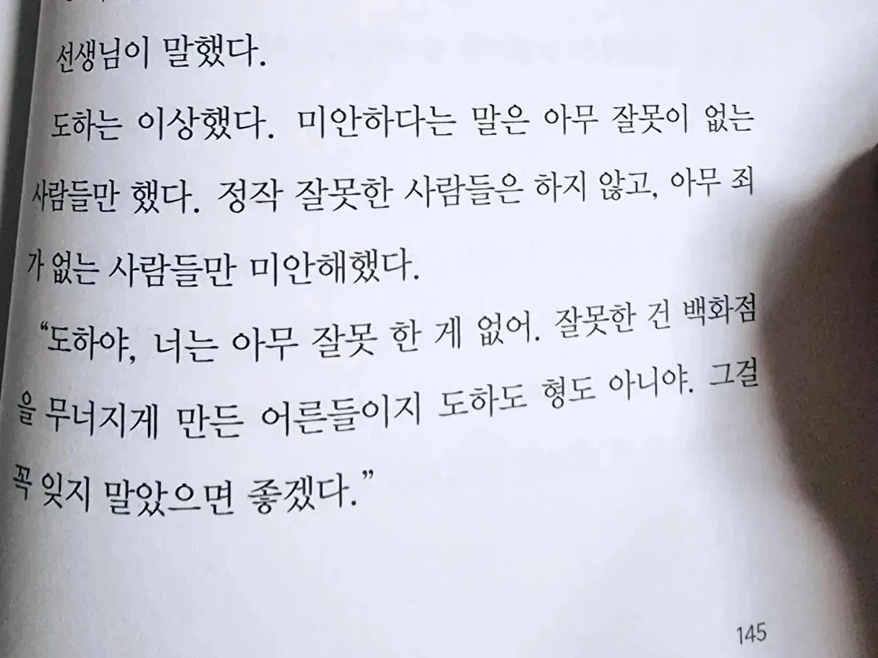 - 선생님이 말했다. 도하는 이상했다. 미안하다는 말은 아무 잘못이 없는 사람들만 했다. 정작 잘못한 사람들은 하지 않고, 아무 죄가 없는 사람들만 미안해했다. “도하야, 너는 아무 잘못 한 게 없어. 잘못한 건 백화점을 무너지게 만든 어른들이지 도하도 형도 아니야. 그걸 꼭 잊지 말았으면 좋겠다.” p.145