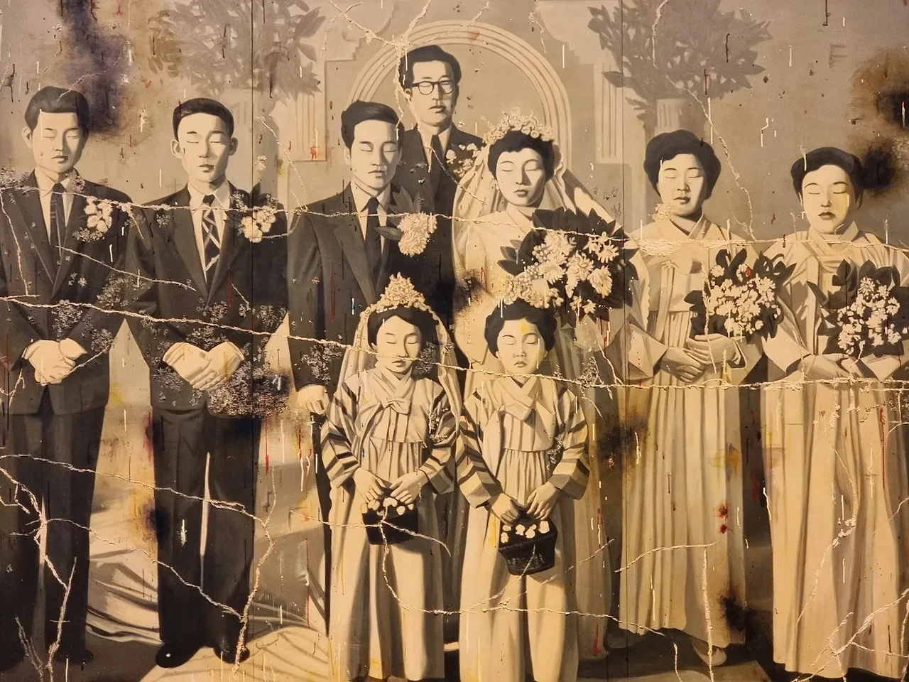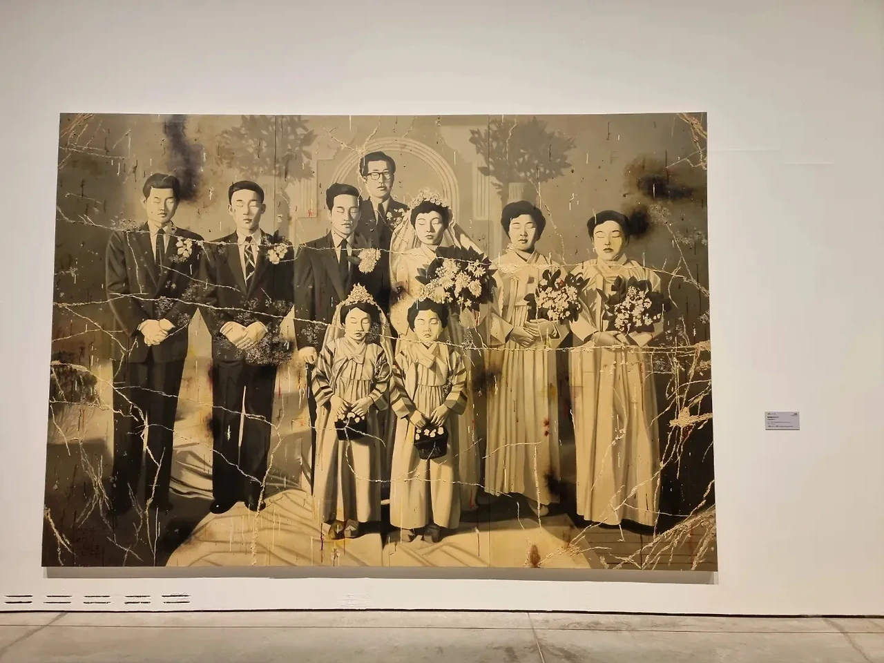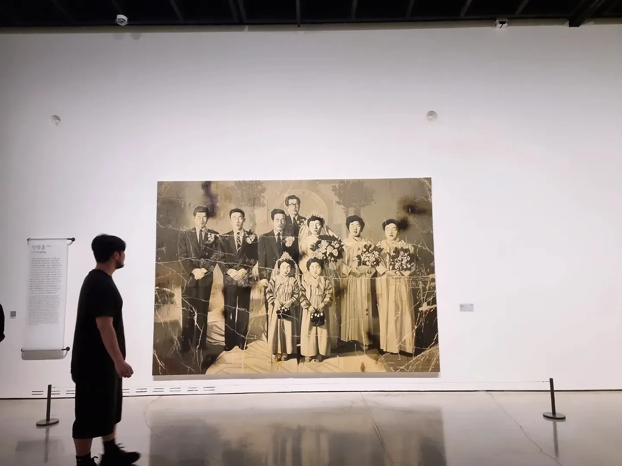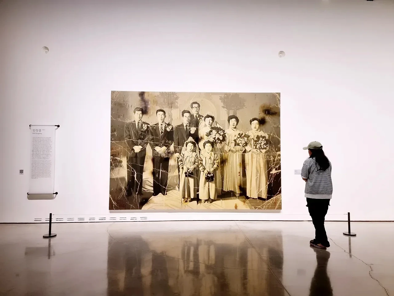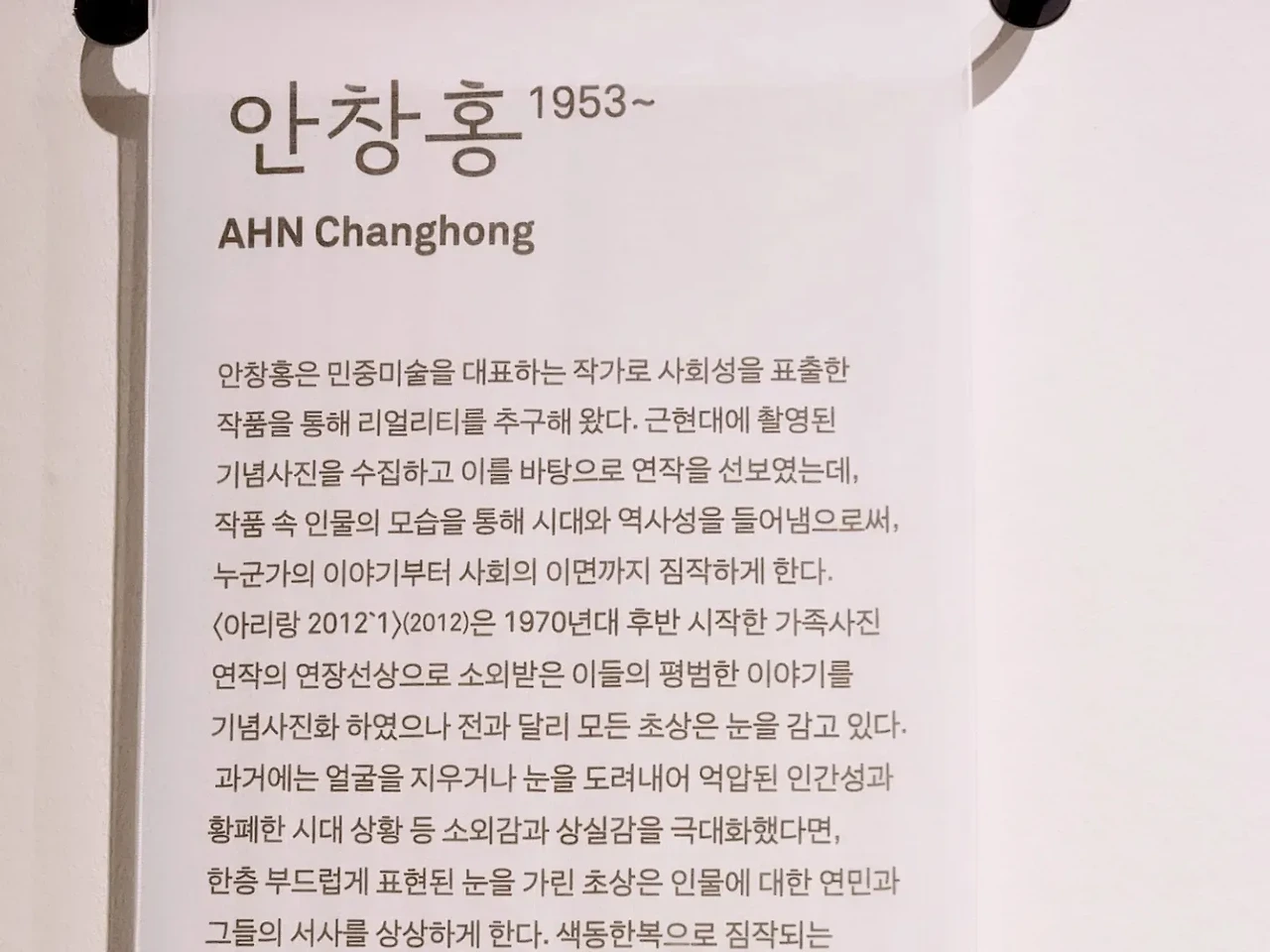 - 나도 모르게 작품 앞에서 멈춰섰다. 옛스러운 느낌의 가족 사진의 인물들은 모두 눈을 감고 있었다. 뭔지모를 애석함과 슬픔이 느껴졌다. 죽음에 대한 생각이 떠오르기도 했다. 작품 명을 보니 [아리랑 2012'1] 였다. 뼈아픈 민족의 역사가 한 폭의 그림 속에서 느껴진다는 것에 작가가 궁금해졌다. 이름부터가 특별하고 남다른 그였다. - 안창홍 작가는 민중미술을 대표하는 작가로 사회성을 표출한 작품을 통해 리얼리티를 추구해 왔다. 근현대에 촬영된 기념사진을 수집하고 이를 바탕으로 연작을 선보였는데, 작품 속 인물의 모습을 통해 시대와 역사성을 들어냄으로써, 누군가의 이야기부터 사회의 이면까지 짐작하게 한다. 1970년대 후반 시작한 가족사진 연작의 연장선상으로 소외받은 이들의 평범한 이야기를 기념사진화 하였으나 전과 달리 모든 초상은 눈을 감고 있다. 과거에는 얼굴을 지우거나 눈을 도려내어 억압된 인간성과 황폐한 시대 상황 등 소외감과 상실감을 극대화했다면 한층 부드럽게 표현된 눈을 가린 초상은 인물에 대한 연민과 그들의 서사를 상상하게 한다.