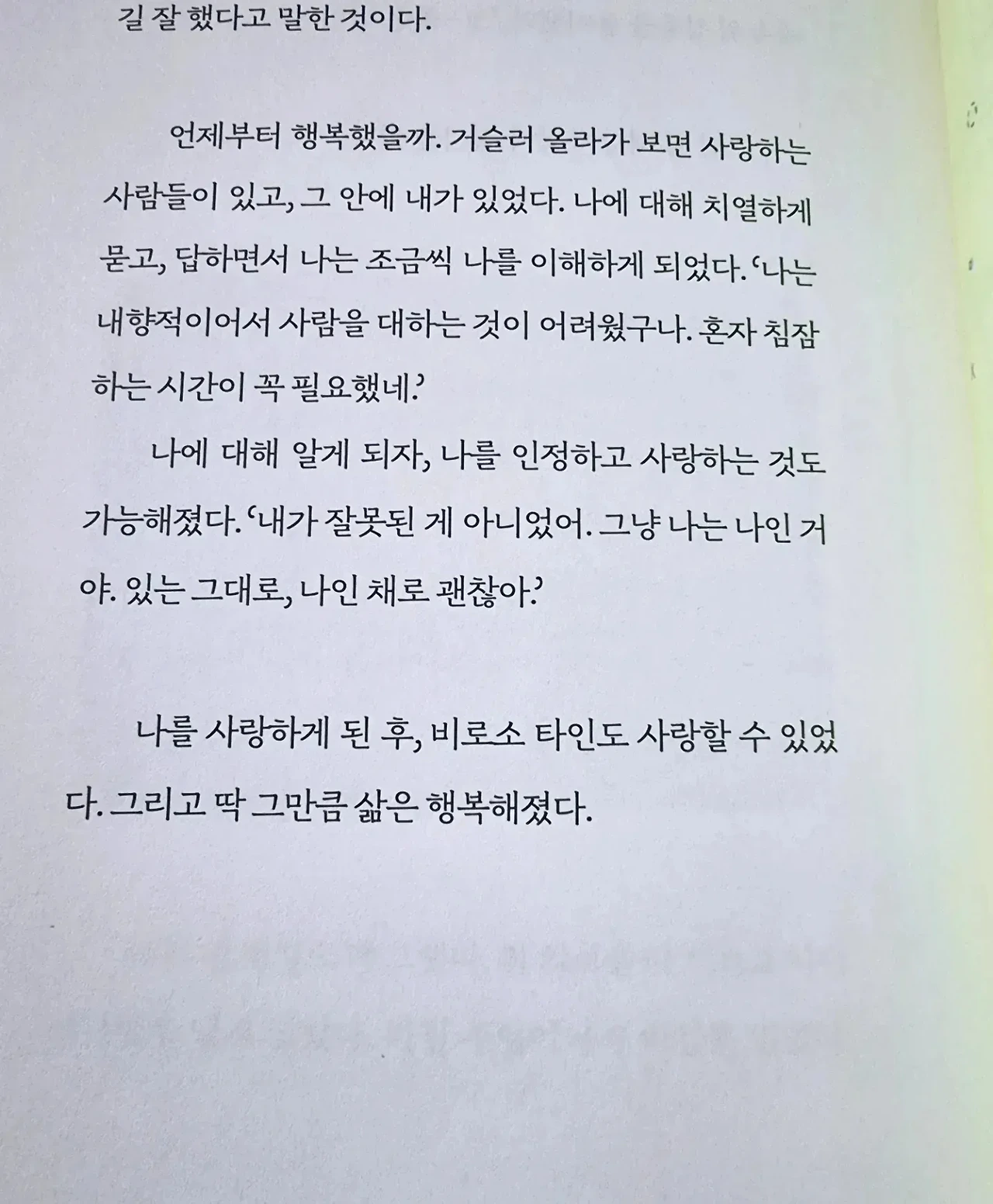- 언제부터 행복했을까. 거슬러 올라가 보면 사랑하는 사람들이 있고, 그 안에 내가 있었다. 나에 대해 치열하게 묻고, 답하면서 나는 조금씩 나를 이해하게 되었다. ‘나는 내향적이어서 사람을 대하는 것이 어려웠구나. 혼자 침잠하는 시간이 꼭 필요했네.’ 나에 대해 알게 되자 나를 인정하고 사랑하는 것도 가능해졌다. ‘내가 잘못된 게 아니었어. 그냥 나는 나인 거야. 있는 그대로, 나인 채로 괜찮아.’ 나를 사랑하게 된 후, 비로소 타인도 사랑할 수 있었다. 그리고 딱 그 만큼 삶은 행복해졌다. p.232