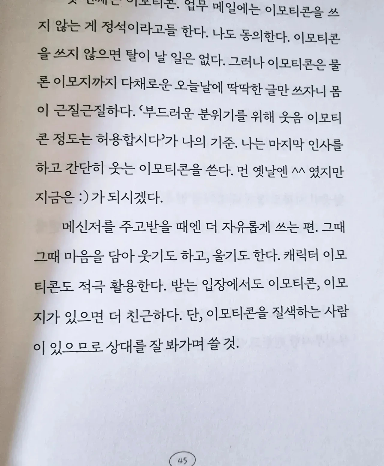 - 업무 메일에는 이모티콘을 쓰지 않는 게 정석이라고들 한다. 나도 동의한다. 이모티콘을 쓰지 않으면 탈이 날 일은 없다. 그러나 이모티콘은 물론 이모지까지 다채로운 오늘날에 딱딱한 글만 쓰자니 몸이 근질근질하다. ‘부드러운 분위기를 위해 웃음 이모티콘 정도는 허용 합시다’가 나의 기준. 나는 마지막 인사를 하고 웃는 이모티콘을 쓴다. 먼 옛날엔 ^^였지만 지금은 :)가 되시겠다. 메신저를 주고받을 때엔 더 자유롭게 쓰는 편. 그때 그때 마음을 담아 웃기도 하고, 울기도 한다. 캐릭터 이모티콘도 적극 활용한다. 받는 입장에서도 이모티콘, 이모지가 있으면 더 친근하다. 단, 이모티콘을 질색하는 사람이 있으므로 상대를 잘 봐가며 쓸 것. p.45