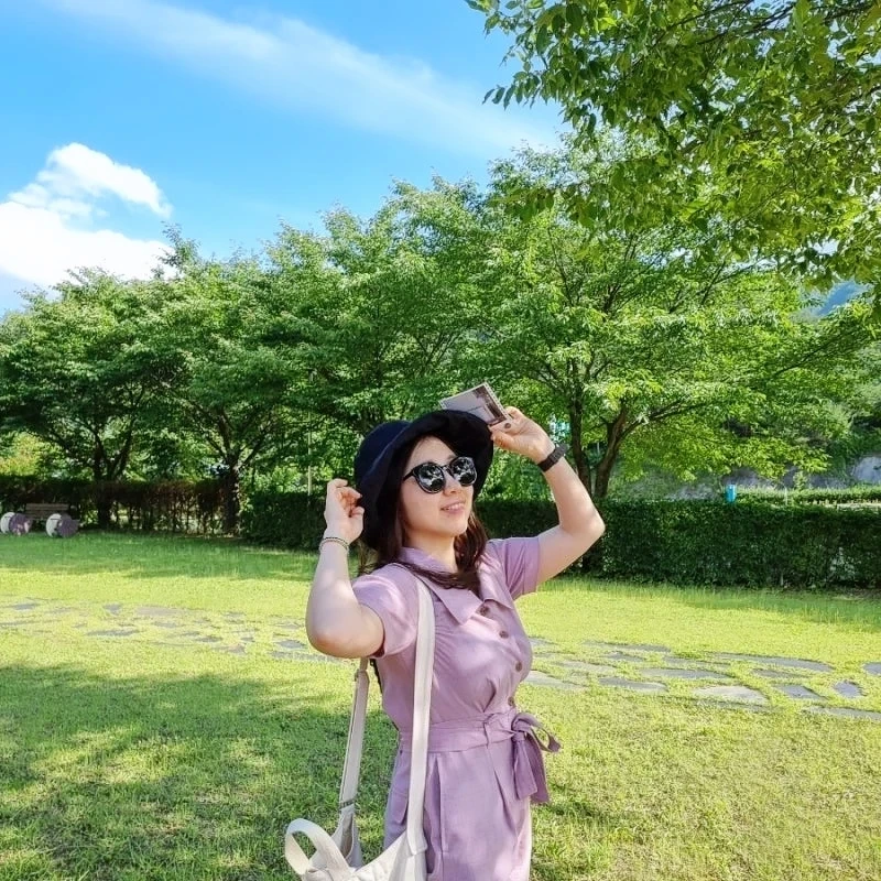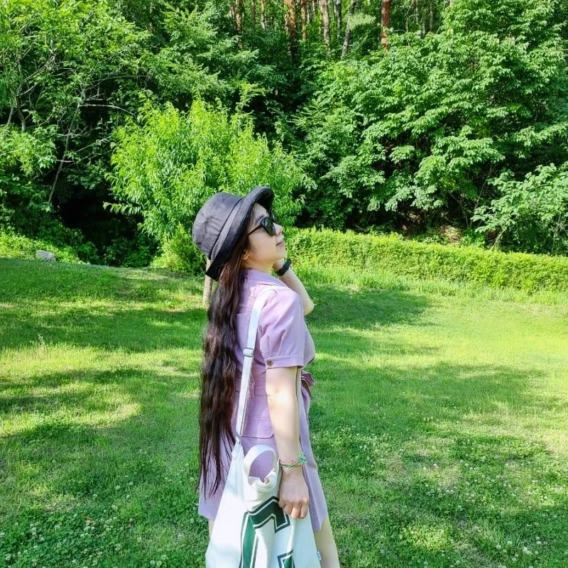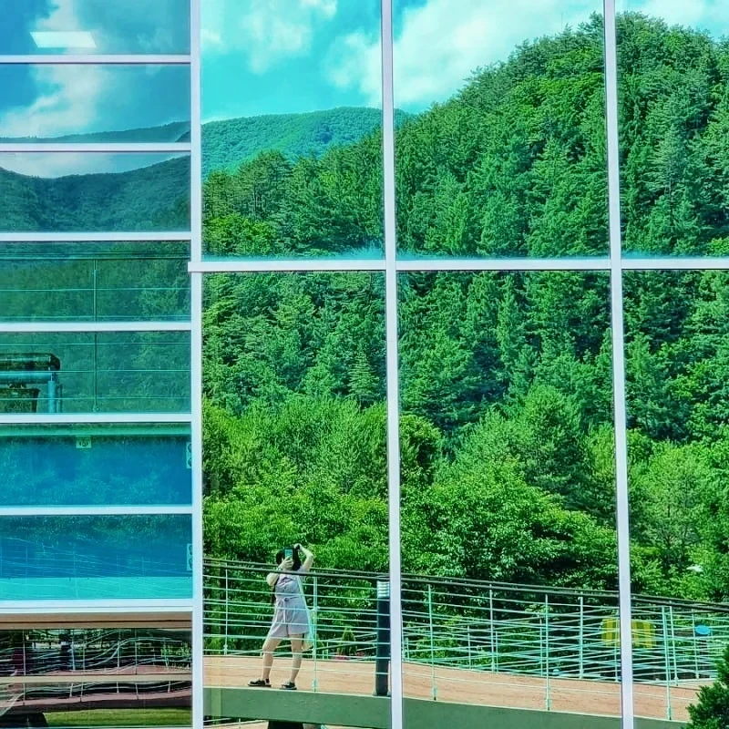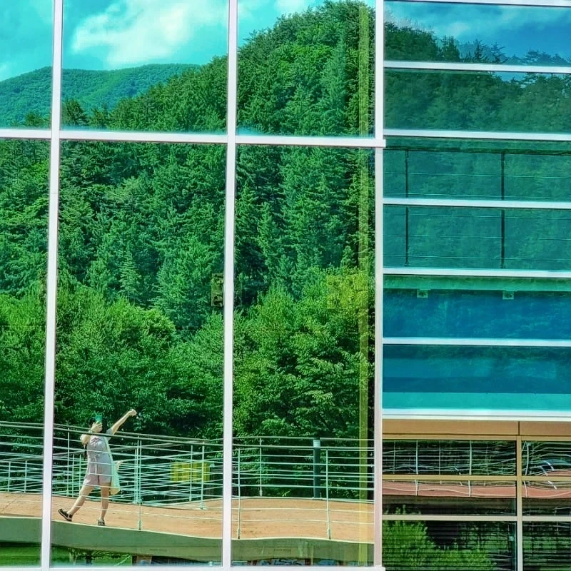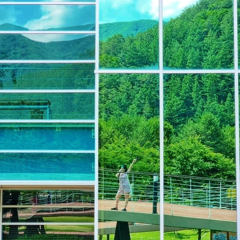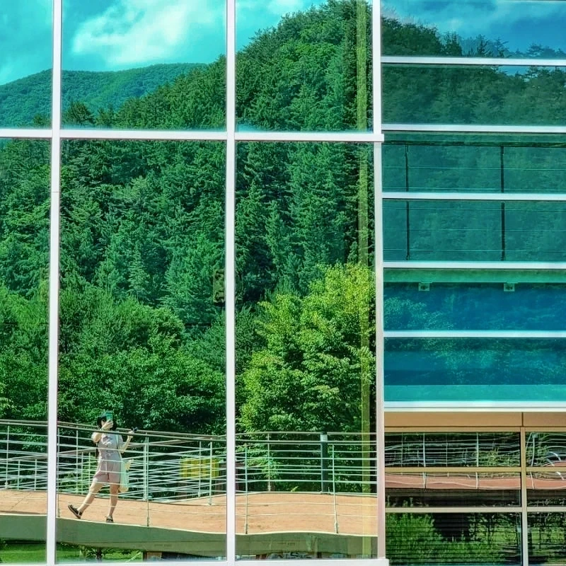 거대한 거울에 비친 푸른 산과 하늘과 행복한 그녀가 있었다.