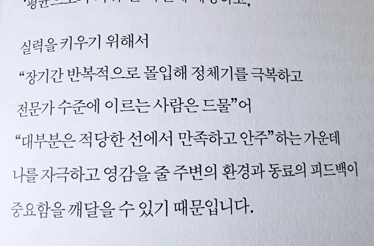 - 운과 실력을 구분할 때 어떤 유익이 있을까요? 나의 실력이 아닌 운이나 “조직 환경의 영향 덕분에 이룬 스타의 성적을 개인의 실력으로 오인”해서 모든결과가 자신의 실력 수준으로 회귀하는 ‘평균의로의 회귀’를 사전에 예방하고 실력을 키우기 위해서 “장기간 반복적으로 몰입해 정체기를 극복하고 전문가 수준에 이루는 사람은 드물‘어 ”대부분은 적당한 선에서 만족하고 안주“하는 가운데 나를 자극하고 영감을 줄 주변의 환경과 동료의 피드백이 중요함을 깨달을 수 있기 때문입니다. p.117