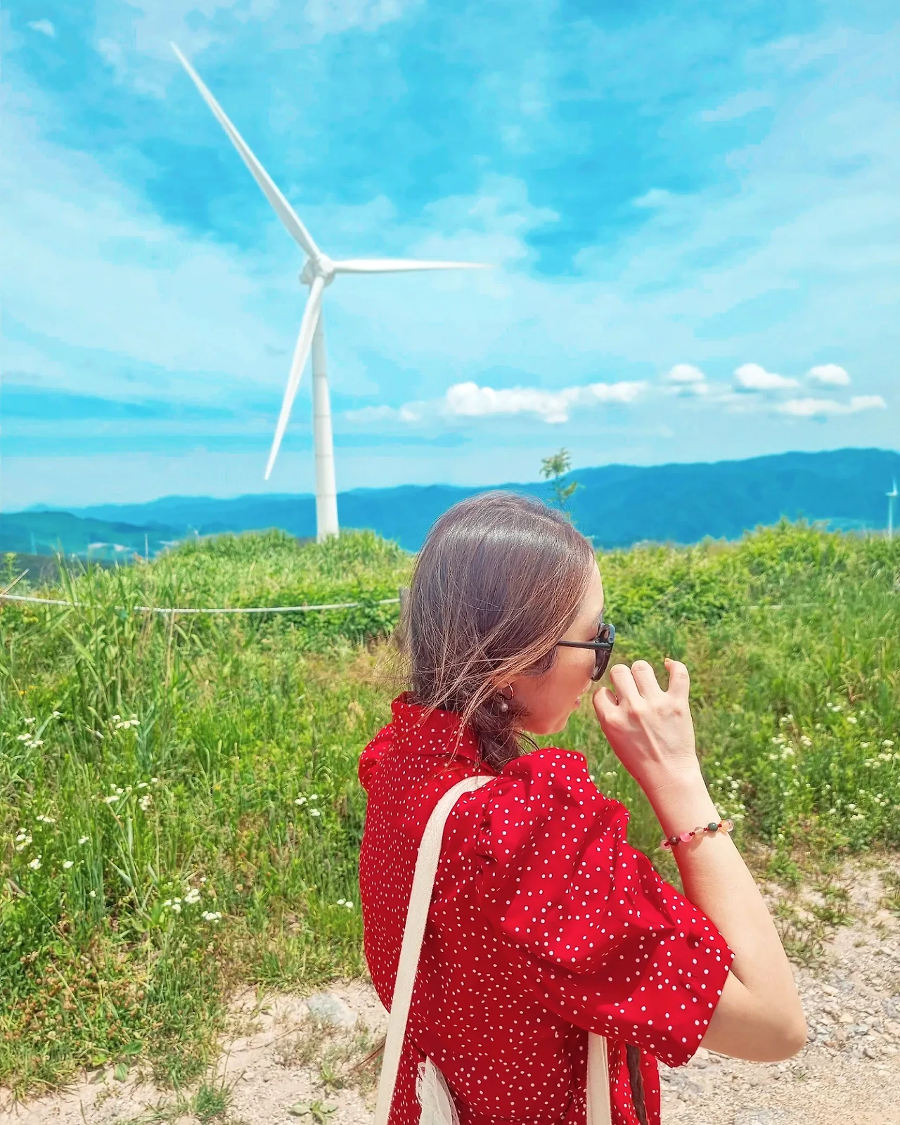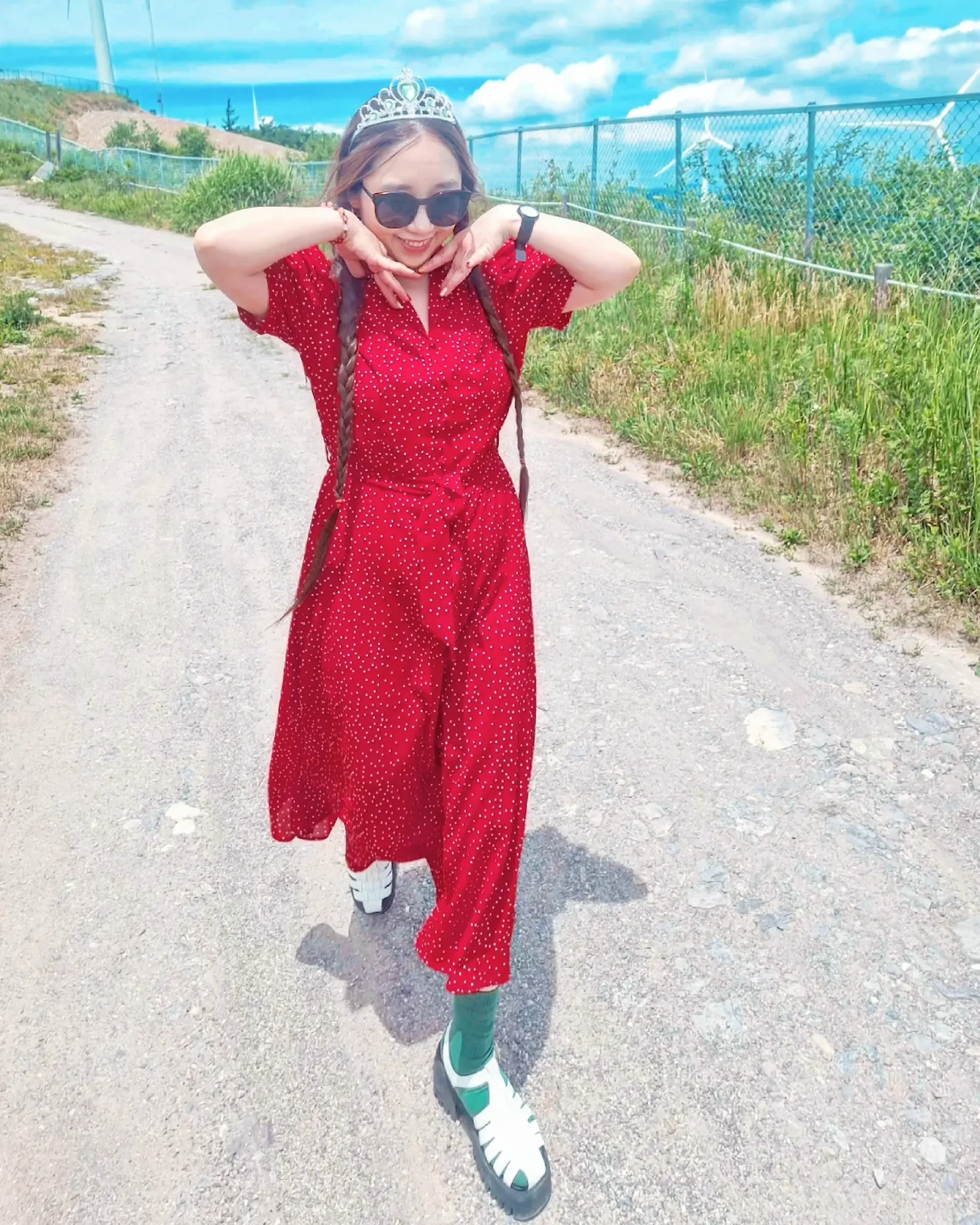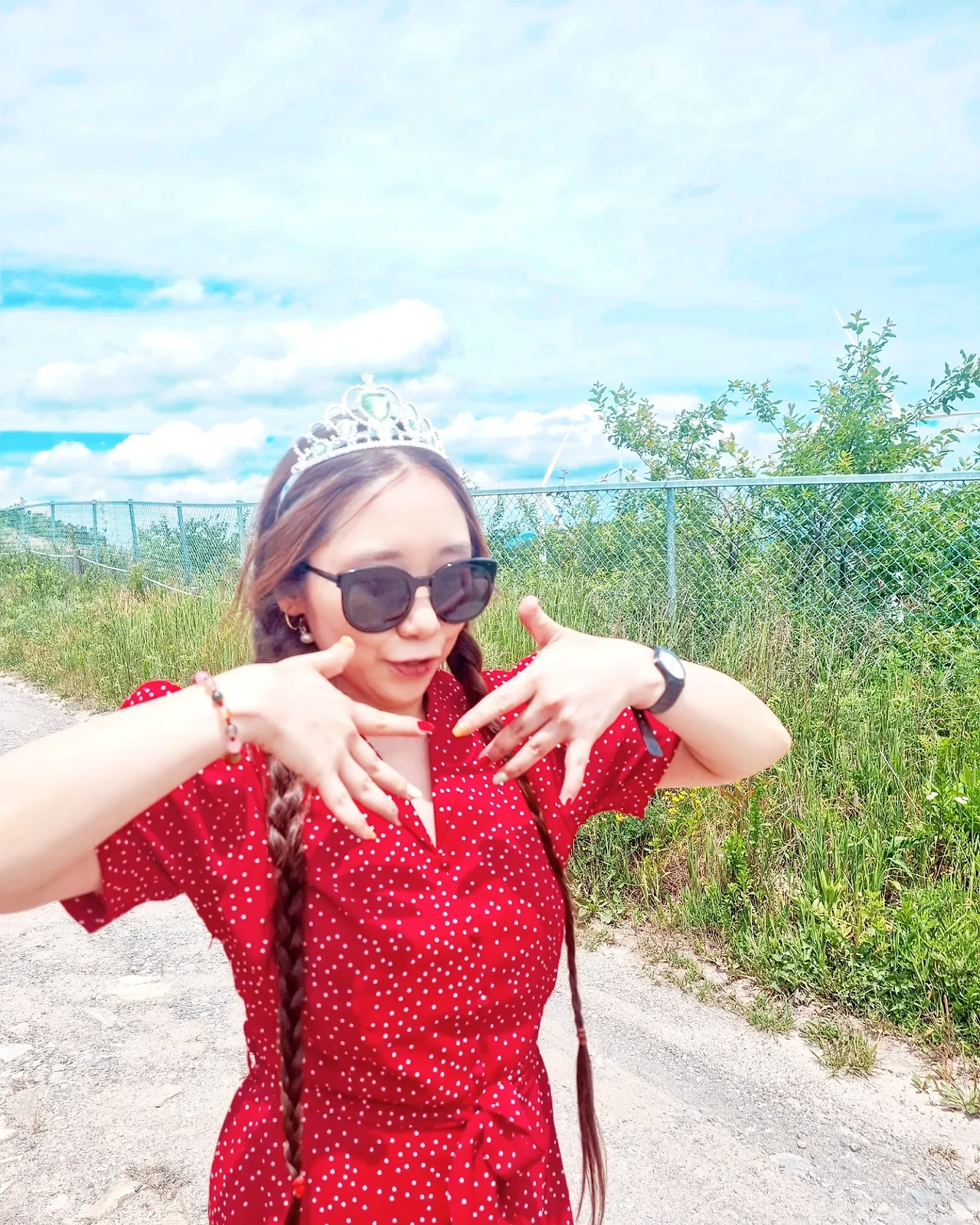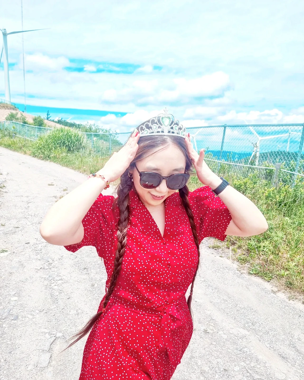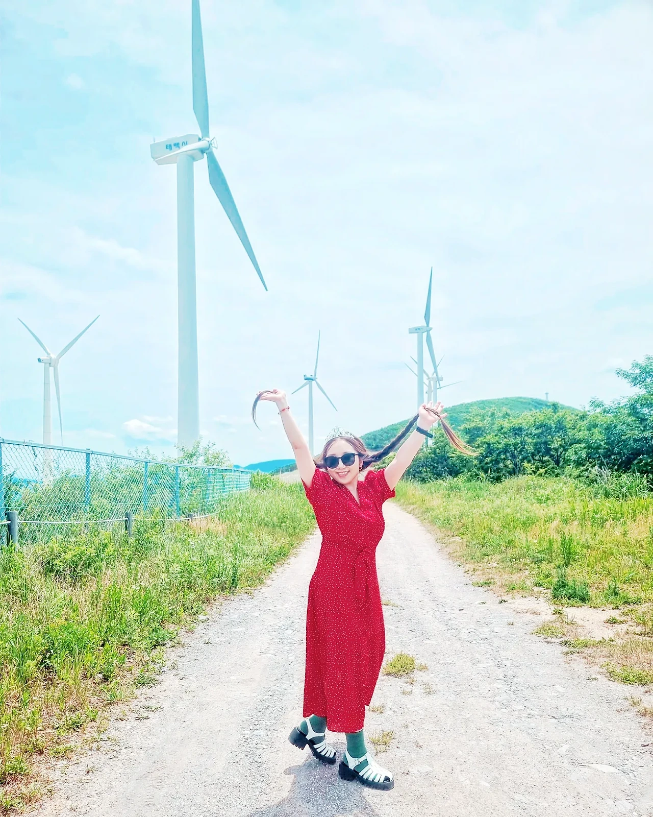 바람이 불어오는 느낌이 좋아서 나풀거리는 긴 치마를 입었다. 강렬한 색과 자연의 색이 조화를 이루고 반짝이는 왕관을 쓰니 동화 속 주인공이 된 것 처럼 묘한 기분이었다. 하늘과 산이 가까이 있고 바람이 부는 그 곳을 걸으며 하늘로 날아오르는 상상을 했다. 새가 될까, 꽃이 될까 허무맹랑하지만 귀여운 상상을 하며 그 길을 걸었고, 그렇게 우리들의 웃음 꽃은 멈추지 않았다.
