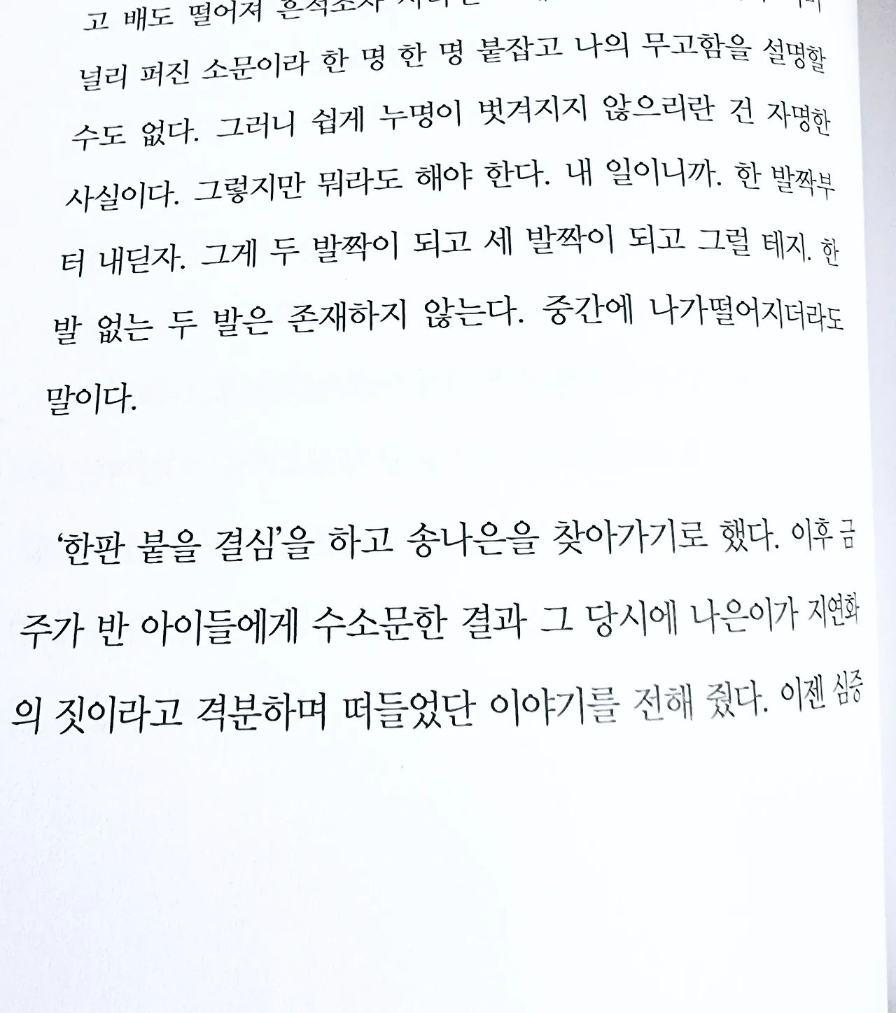 거기다 이미 널리 퍼진 소문이라 한 명 한 명 붙잡고 나의 무고함을 설명할 수도 없다. 그러니 쉽게 누명이 벗겨지지 않으리란 건 자명한 사실이다. 그렇지만 뭐라도 해야 한다. 내 일이니까. 한 발짝부터 내딛자. 그게 두 발짝이 되고 세 발짝이 되고 그럴 테지. 한발 없는 두 발은 존재하지 않는다. 중간에 나가떨어지더라도 말이다. ‘한판 붙을 결심’을 하고 송나은을 찾아가기로 했다. 이후 금주가 반 아이들에게 수소문한 결과 그 당시에 나은이가 지연화의 짓이라고 격분하며 떠들었단 이야기를 전해 줬다. p.44